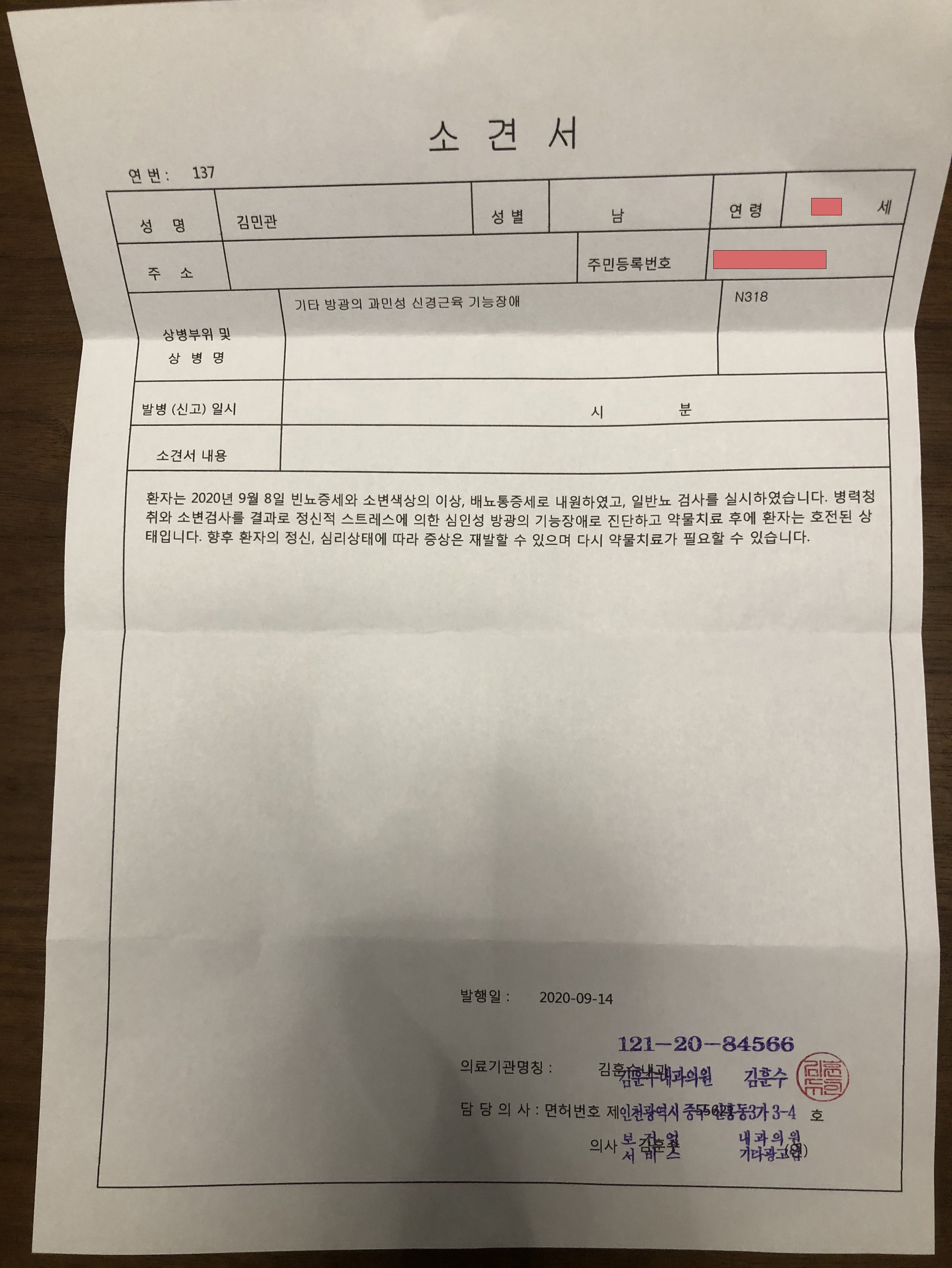 심신미약 상태를 들어 이 사건에서 물러나려 했던 자세를 취했던 것 사과드립니다. 다만 사건 이후 삶의 정상적인 패턴이 무너졌고, 현재도 정상적인 생활을 하고 있지는 못합니다. 제 고통을 호소하는 게 아니라 제 말이 거짓이 아님을 말하기 위해, 9월 8일 병원에 갔다 온 것에 대해 9월 14일 받은 의사소견서를 첨부합니다[첨부 ⑨]. 몸 상태가 정상이 아니었던 것, 그리고 지금도 심리적으로 많은 스트레스를 받고 있는 게 사실이지만, 책임지지 않는 자세를 견지하지 못한 점을 시인합니다. 그렇지만 저는 정신을 다잡고 이 글을 쓰고 있습니다.