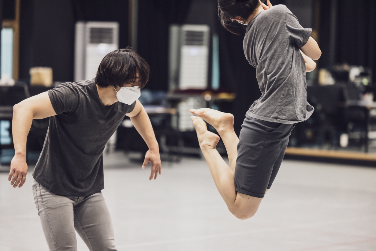국립현대무용단_그후1년_승화_워크숍 현장사진 ⓒAiden Hwang 〈승화〉는 안무가 랄리 아구아데의 안무 과정을 바탕으로 백종관 작가의 연출로 만든 댄스필름이다. 여기에는 약간의 설명이 필요한데, 연출의 개념에는 영상 촬영과 편집 과정이 포함되어 있다는 점에서, 안무에서 연출로의 모호한 전환―그 둘이 하나의 레이어상에서 종합되어 제시된다는 점에서―에는 저자의 이양이라는 어떤 타협의 지점을 가정해 볼 수 있을 것 같다. 여기에는 랄리 아구아데 안무를 영상으로 재현하는 것이 아니라 그 과정을 기록하고 편집한다는 관찰자의 시각이 부상한다는 점에서 그러하다. 이를 다시 랄리 아구아데가 최종적으로 확인했는지의 여부와는 별개로, 아무래도 이 최종 매체의 형식은 백종관 작가가 주도권을 가지고 있다. (그렇다면 사실상 영상에서 연출은 안무의 영역을 포함하지 않는가라는 질문이 주어질 차례이다.) 이는 애초에 의도되지 않은 채 이 매체의 형식이 결정되었다는 점에서 전적으로 유래한다고 보인다. 그러니까 극장 위에서의 현존하는 몸이라는 매체가 팬데믹 상황으로 기각되었다.