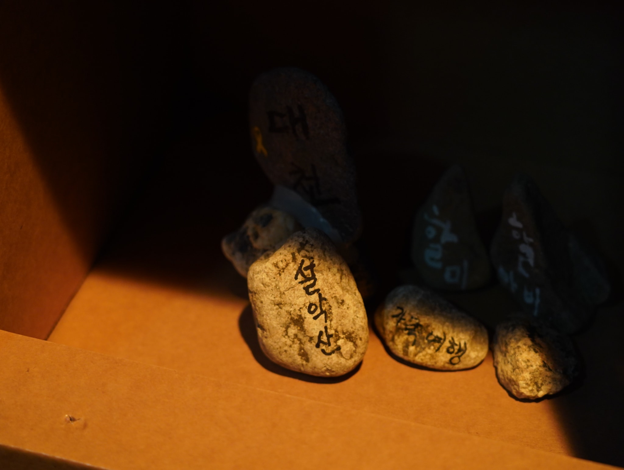 극장 안에 있는 조약돌은 극장 바깥에서부터 이어졌다. 우리가 첫 번째로 안산이 아닌 혜화동을 거닐며 놀랍게도 세월호를 인식하게 되는 건 담장 위에 놓인 몇몇 단어가 적힌 조약돌들로부터이다. 그것이 세월호 유가족의 개인적 기억이나 경험을 반추하는 것인지 아닌지가 확실하지 않은 상황 가운데서도 개인적으로 그것은 어떤 실재의 현현과 풍경의 전환을 가져왔는데, 이러한 드러남은 장소 특정적이지 않은, 곧 장소에 기대지 않은 채 나와 세월호 사이에 어떤 틈을 들여다보게 했다.
