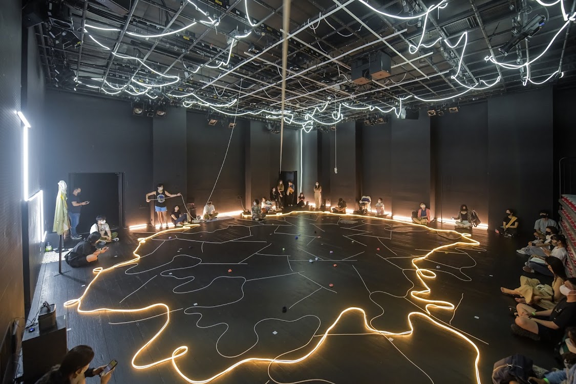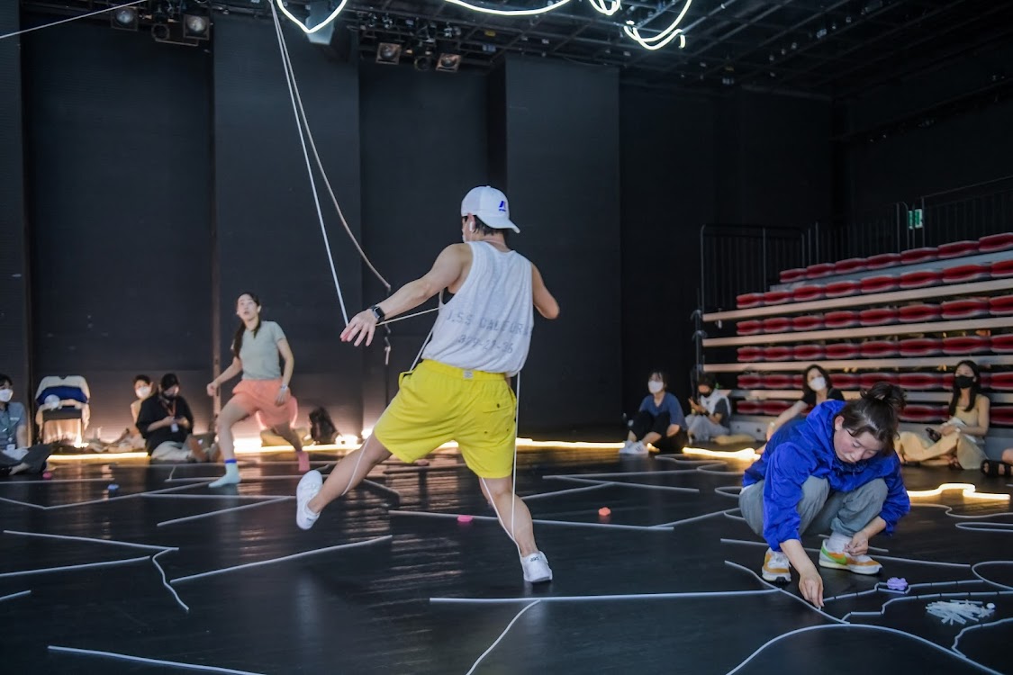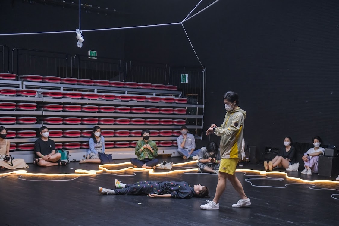 내용에 틈이 생기는 순간, 극장이 환기된다. 막의 전환을 알리는 몇몇 순간에는 천장의 조명이 켜지고 또 꺼지며 네온사인 줄이 빛나는 순간이 있는데, 극장 전체가 얇은 선의 모티브로 구성되었음을 지시한다. 극장 측의 안내방송도 그 틈을 따라 공연 일부로 삽입된다. 방역 지침과 연동된 극장 동선의 규제에 대한 부분이다. 여기에 예외적으로 세 시간의 러닝타임을 규제하며 마지막 순간을 지정하는 부분이 있다. 이 둘은 모두 공연의 협력 주체로서 공연자 측과의 합의를 명시하는 역할이 극장 측에서 드러남을 의미한다.