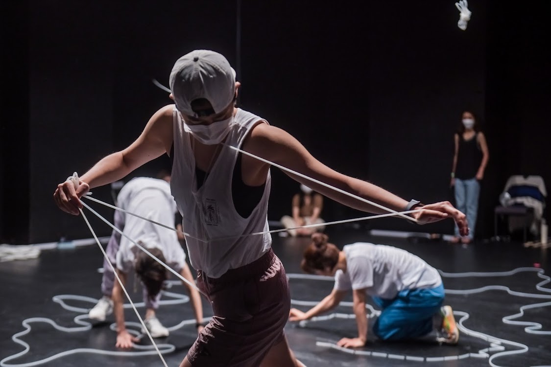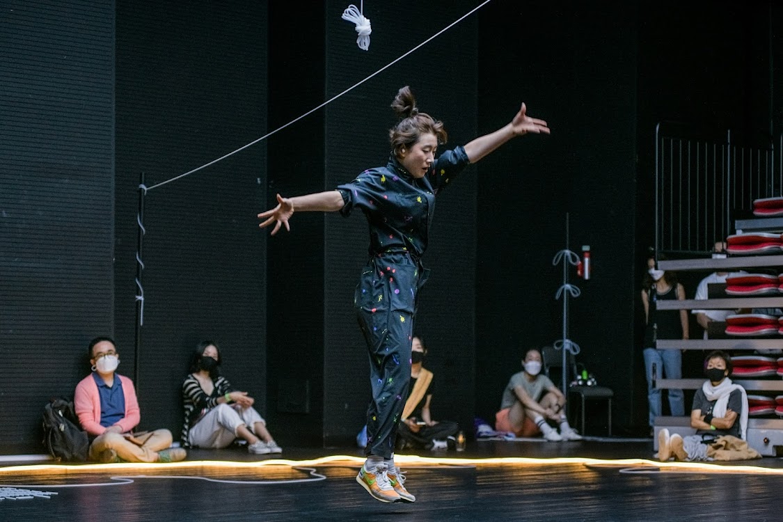 김지형 무용수가 무대 왼쪽에서 극장 천장으로부터 연결한 고무줄을 잡고 있다.