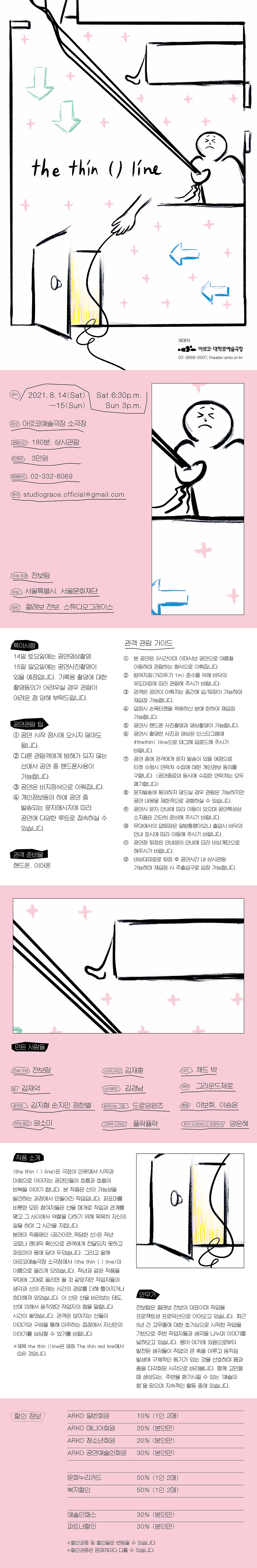 〈the thin ( ) line〉은 극장이라는 총체적 공간의 사유 아래 유동하는 극장의 움직임들을 구성하고 또 구성한다. 곧 그것은 극장이 건축의 일부라는 점, 또한 이동을 통해 도달한다는 점, 여러 다층적 공간으로 이뤄졌다는 점 등에 대한 인식이다. 동시에 일 대 일의 시간이 아니라 다 대 다의 시간이라는 지점에서 〈the thin ( ) line〉은 헐겁지만 파편들의 총체적 시간을 만들어 간다. 사진이나 영상을 찍고 태그를 걸어 SNS에 올릴 수 있게 한 점은, 공연의 연속선상을 기약하는 것 이전에 공연이 이미지로 축소되며 수용될 수 있음을 인정하는 것에서 출발한다. 하지만 더 큰 전제는 이 공연이 총체적 시간의 유기적 형태가 될 수 없음을, 온전하거나 완전한 총체와 그 시선이 불가능함에 있는 것 아닐까.