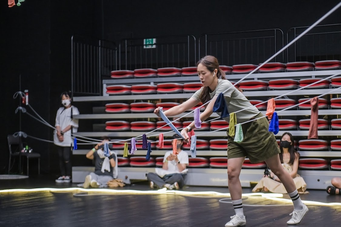무용수 손지민이 양말을 가지고 움직이는 동안, 빨랫줄이 되는 고무줄은 어느 정도 고정된 무대의 자리를, 동시에 관객과의 안전한 거리를 만들며 관조의 대상이 된다. 이러한 안전한 위치, 편안한 위치는 수동적 관객이 요청하고 기대하는 자리이기도 하며, 손지민의 움직임은 그 움직임 자체의 매력을 기반으로 한다. 러닝타임과 공간의 구성 모두 파편적이기보다 온전한 단위를 이루는 듯 보인다. 고무줄을 무대 중앙에 분배하고, 색색의 양말을 한 짝씩 벗어 놓고 이동하기―한국무용의 스텝을 사용하기, 그리고 무대 가의 기둥으로부터 고무줄을 묶어 길게 끌어와서 공중에 올린 후 빨랫줄처럼 곳곳에 양말을 가져오기―회전반경을 만드는 다른 스텝 사용하기, 그리고 그 위에 걸어 놓는 이차의 움직임은 매우 선연한 인상을 준다. 양말 역시 얇은 선의 모티브에서 연장된다. 하지만 거기에는 색의 차이들이 있다. 무대의 안정적 시간의 차원에서 손지민과 두 퍼포머와의 차이를 구성할 수 있다면, 분산된 시각과 시간을 통한 공연의 역전과 확장, 재전유로서의 시도는 이와 충돌하는가. 하지만 이런 충만한 시간 속에 3시간의 대부분을 모두 수용할 수 있었던 것 역시 생각해볼 수 있을 것이다. 또한 시간의 벗어나기, 또는 시간의 입체화하기의 전략은 이 시간과 공간이 절대적이지 않은 것이라는 지점에서 사실상 가능할 것임을 생각해봐야 할 것이다.