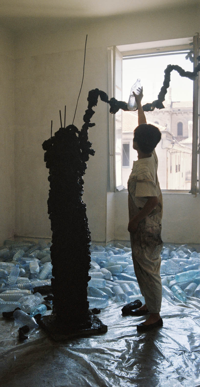 〈나를 불태우다〉(1986-1987) 역시 퍼포먼스의 일환으로 제작되었지만 그 결괏값은 사진인데, 페트병들이 바닥에 깔려 있고, 그 앞에 작가 키 정도의 나무 한 그루와 위로 손을 들어 페트병을 들고 돌아서 있는 작가의 모습이 함께 담긴 모습이다. 나무는 검게 탄 페트병들이 이룬 나무이다. 작가가 온전히 드러난 이 작품은 어두운 대안공간 루프 공간의 환경에서 몸을 사리며 어두운 인장처럼 각인된다. 물을 주는 듯한 제스처로부터 두 신체의 마주함과 교환의 열망 또는 전이의 메타포를 드러내는 듯하다.