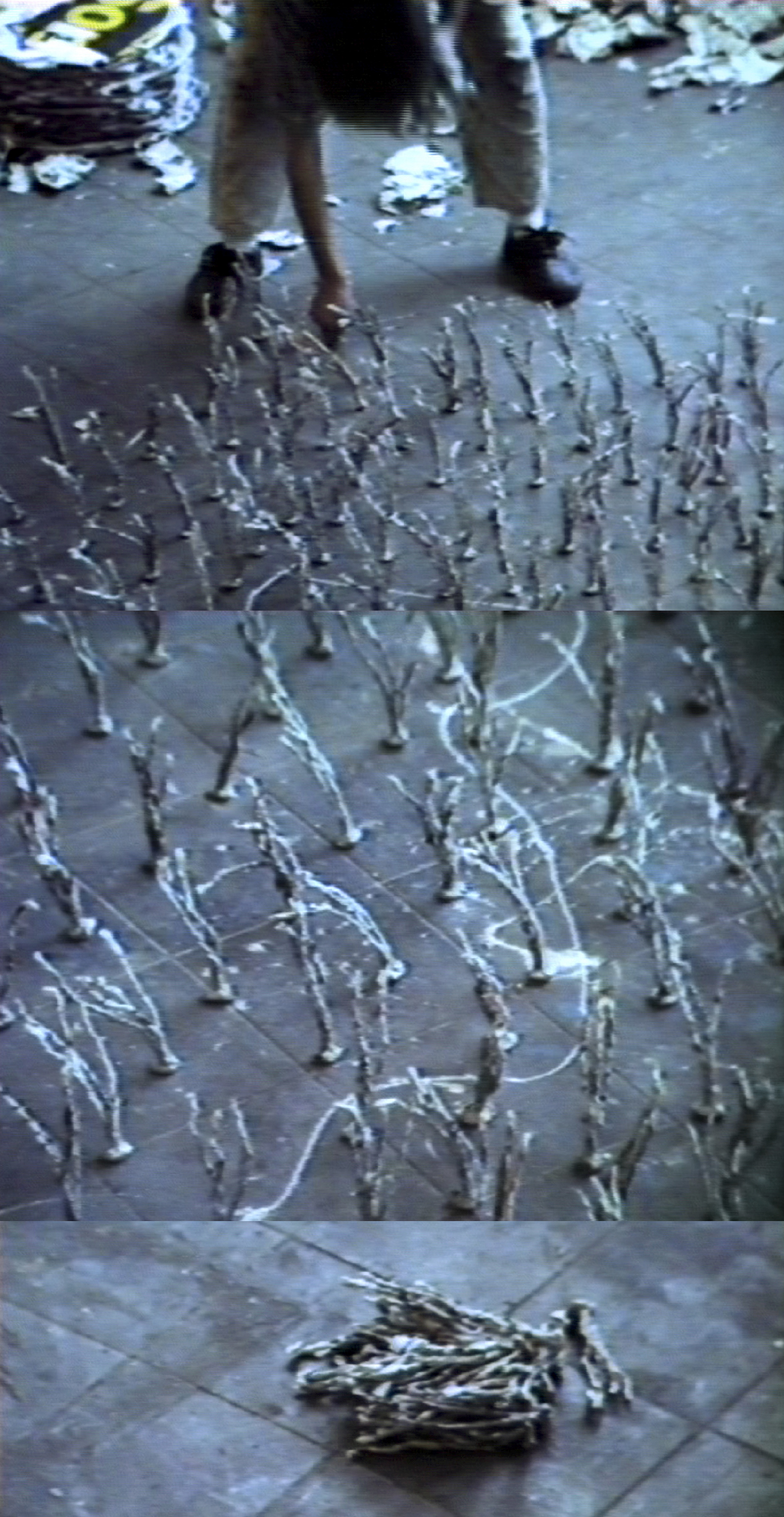 이는 작가가 ‘자리 잡기’로 번역한, 영어와 독일어 모두 같은 프랑스어 ‘Localisation’으로 명명한 지역을 이동하며 이뤄진 네 개의 퍼포먼스의 일환으로, 그중 첫 번째로 수행되었다. 두 번째 1988년에는 독일 브라운슈바이크에서 행한 〈Reis pflanzen(Planting Rice, 모심기)〉은 신문지와 동전을 사용한 오브제를 시멘트 바닥에 심는 퍼포먼스였다. 세 번째 1989년 다시 님므에서 실시한 〈Bleibt wie Baum(나무처럼 머물기)〉은 통나무와 작가를 붉은 줄로 발가락에 묶어 불안정한 제자리를 지키고 있으려 했던, 정적이지만 매우 미세한 떨림을 반영하는 유동적인 작업이었고, 마지막 퍼포먼스는 같은 해 앉아서 출생연도부터 한 해씩 동그랗게 연도를 이어 적어가며 그 크기를 바깥으로 확장해 가는 퍼포먼스 〈Von 1960 bis 2080(1960년에서 2080년까지)〉였다. 모든 장소는 신체 너머의 경계와 연관되면서, 그 경계로 신체를 확장한다. 자리 잡기는 토지의 소유를 의미하는 게 아닌, 바깥과의 불안정한 관계에서 발생하는 신체의 수행과 그것이 사회를 가리키며 발생하는 정동을 이야기하는 것으로 보인다.
