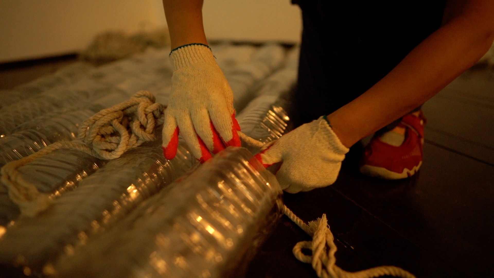 〈매트, 보트, 카펫-나의 매트, 가족을 실을 배, 모두를 위한 양탄자〉(1988, 2021) 〈매트, 보트, 카펫〉은 페트병들과 이를 잇는 줄을 통해 일종의 매트와 그에 연결된 보트 형태를 전용한 것이지만, 그 제목은 오늘날 해양을 건너는 이주민과 그들의 집에 대한 이상과 가족 단위의 삶, 그리고 모두가 같지 않은 세계의 경계를 포괄한다―이 작업은 1988년 작가가 체류했던 프랑스 님므에서 엄청난 홍수를 겪고 생수병이나 플라스틱병 같은 구호품들이 돌아다니던 상황이 모티브가 된 것으로, 2021년 이전의 페트병들(이는 1988년 당시 위아래 부분을 잘라, 작가의 말에 따르면, “구슬”처럼 꾈 수 있는 재료로 다듬어진 상태로 계속 보관되었다.)이 다시 꺼내져 새로운 작업으로 구성되며 당시의 맥락에 더해 현재의 시점들이 중첩될 수 있다. 그 옆에 위치한 〈내비게이션〉(2021)은 물의 표면 위 햇살이 담긴다. 잘 들리지 않는 파도 소리와 모터 소리는 이 물과 존재를 함께하는 사람들에 대해 감각하게 한다. 그렇다면 고여 있는 물 위의 빛은 이주민에게 경로에 대한 좌표로 기능할 수 있을 것인가.