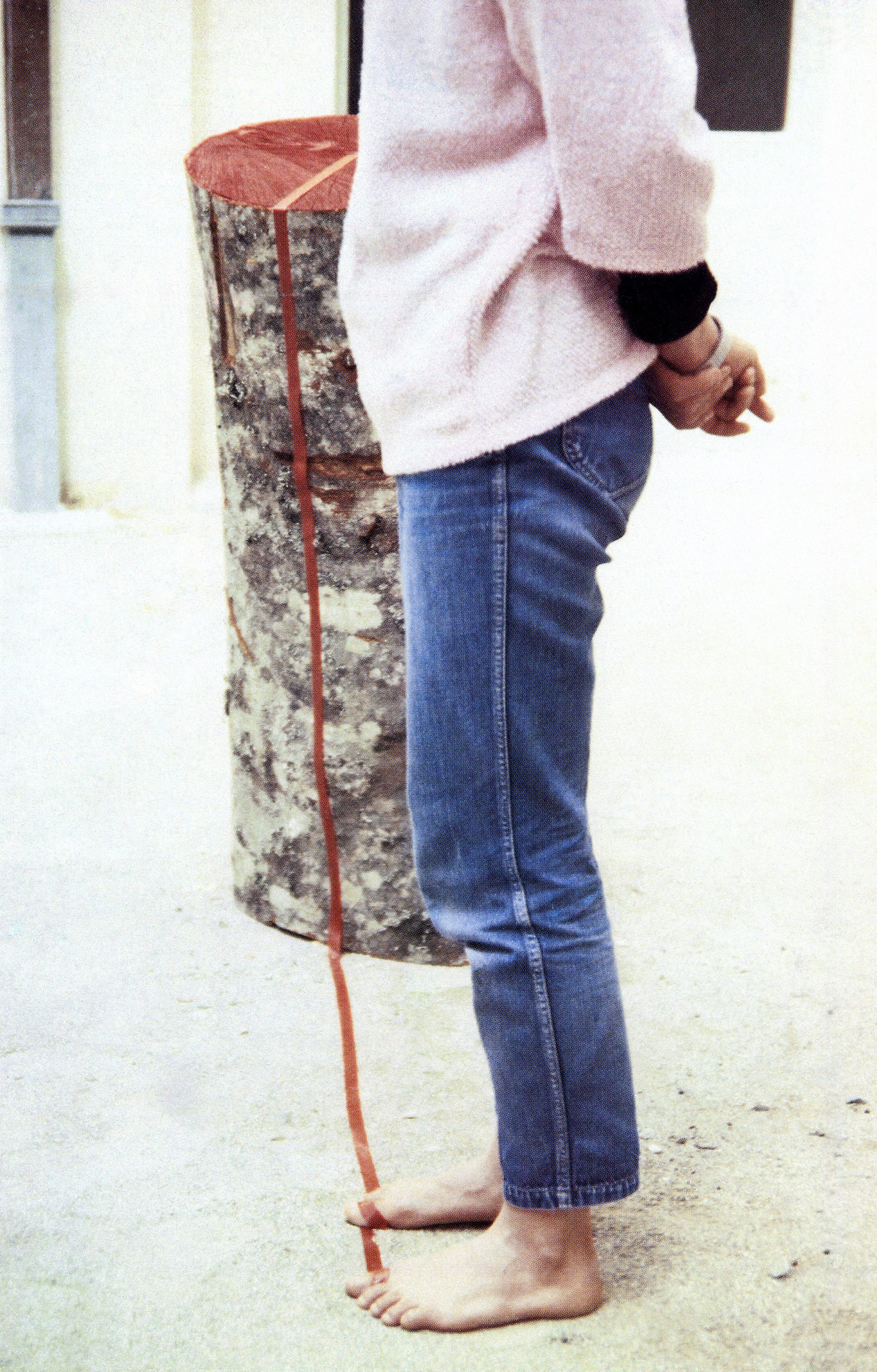 하차연, 〈Bleibt wie Baum(나무처럼 머물기)〉(1989) 이는 작가가 ‘자리 잡기’로 번역한, 영어와 독일어 모두 같은 프랑스어 ‘Localisation’으로 명명한 지역을 이동하며 이뤄진 네 개의 퍼포먼스의 일환으로, 그중 첫 번째로 수행되었다. 두 번째 1988년에는 독일 브라운슈바이크에서 행한 〈Reis pflanzen(Planting Rice, 모심기)〉은 신문지와 동전을 사용한 오브제를 시멘트 바닥에 심는 퍼포먼스였다. 세 번째 1989년 다시 님므에서 실시한 〈Bleibt wie Baum(나무처럼 머물기)〉은 통나무와 작가를 붉은 줄로 발가락에 묶어 불안정한 제자리를 지키고 있으려 했던, 정적이지만 매우 미세한 떨림을 반영하는 유동적인 작업이었고, 마지막 퍼포먼스는 같은 해 앉아서 출생연도부터 한 해씩 동그랗게 연도를 이어 적어가며 그 크기를 바깥으로 확장해 가는 퍼포먼스 〈Von 1960 bis 2080(1960년에서 2080년까지)〉였다. 모든 장소는 신체 너머의 경계와 연관되면서, 그 경계로 신체를 확장한다. 자리 잡기는 토지의 소유를 의미하는 게 아닌, 바깥과의 불안정한 관계에서 발생하는 신체의 수행과 그것이 사회를 가리키며 발생하는 정동을 이야기하는 것으로 보인다.