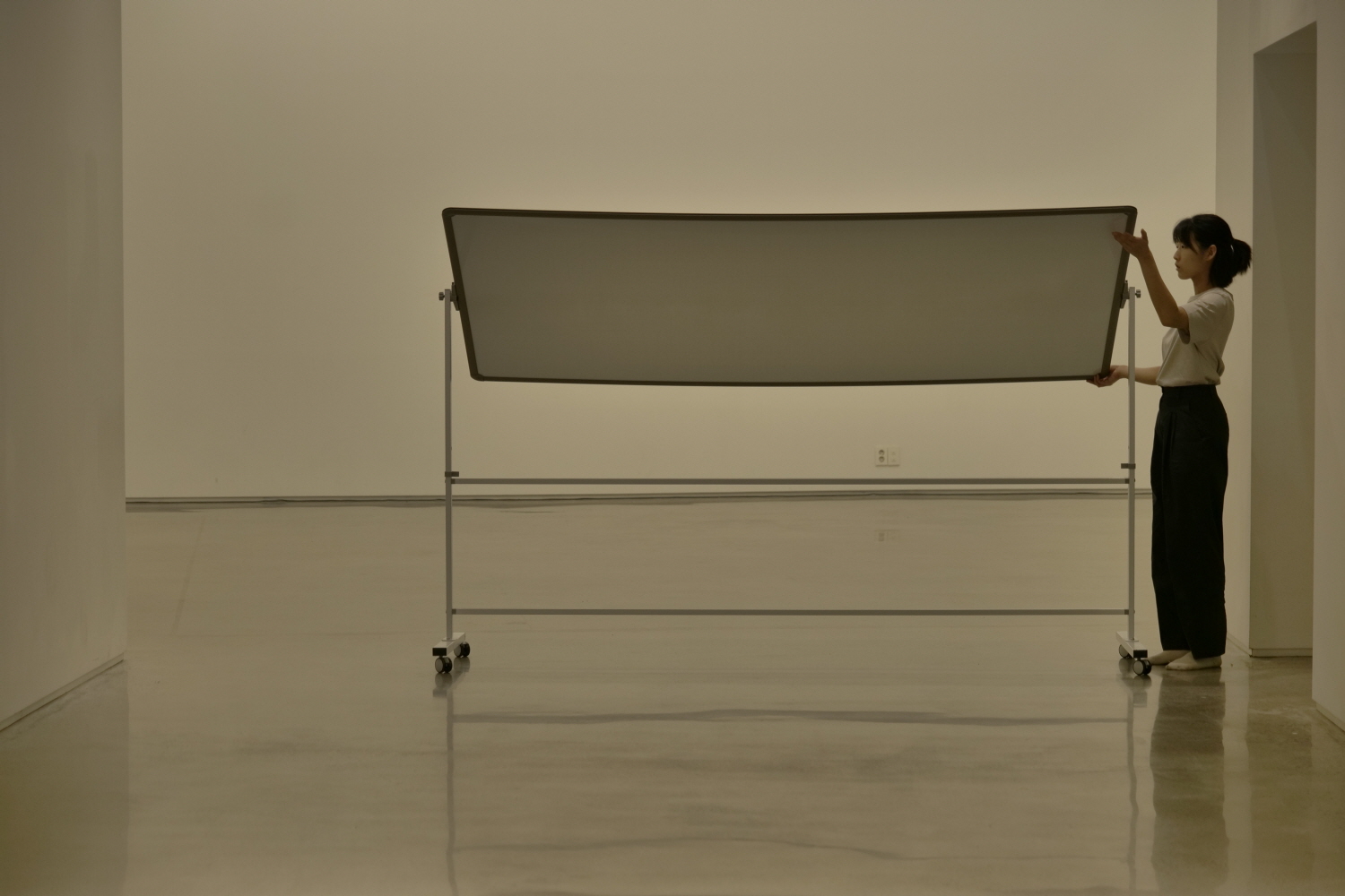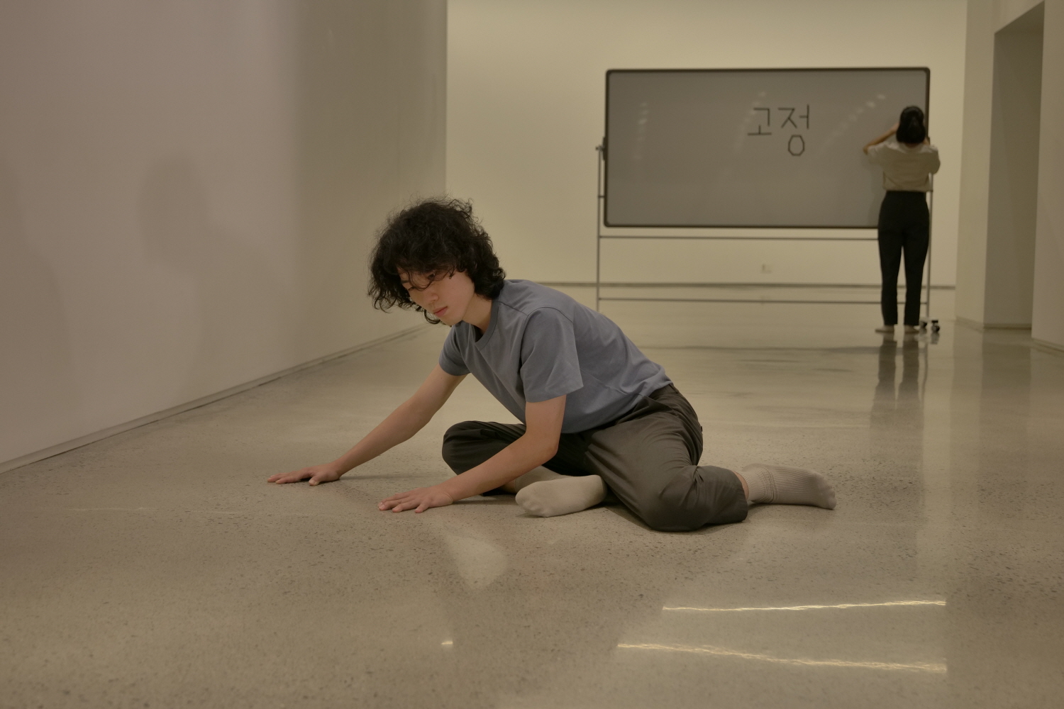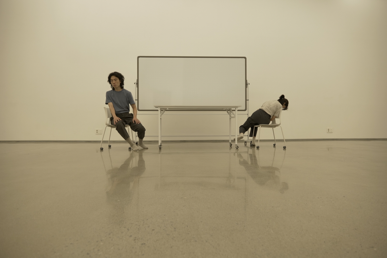 첫 번째 장면인, 테이블을 중간으로 두고 서로 마주한 이종현과 유지영은 서로를 복제한다. 거울의 반영이 아니라 동시에 같은 움직임을 각자의 방향에서 한다. 그리고 테이블 옆에 세워진 커다란 화이트보드를 잡고 발을 굴려 이동한다. ‘기다란 선을 따라 무한히 이동하는’ 건 더딘 움직임 사이의 균열점들, 곧 분절 지점들이거나 이동할 때 바닥을 짚는 양말과 바닥의 마찰 같은 것들인 한편, 무엇보다 끊길 듯 지속되는 레코드판에서 새어 나오는 듯한 음악의 층위다.