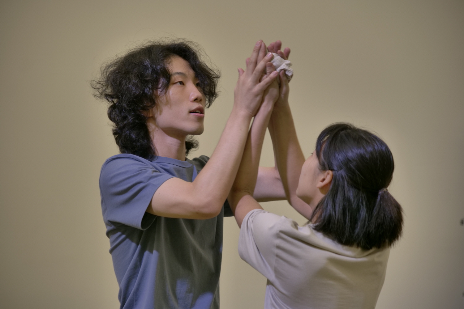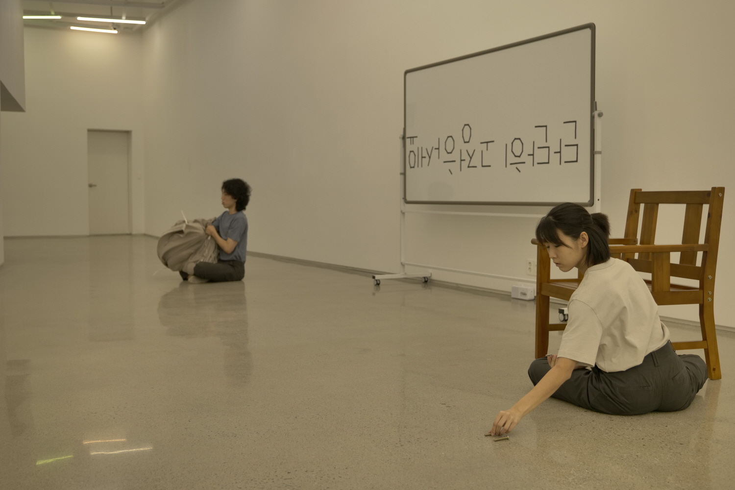 두 번째 장면은, 이동 후에 도착한 화이트보드가 전면에서 이 둘의 얼굴을 가리고 있고, 이 둘은 바지에서 자석을 꺼내 화이트보드에 붙이는 걸로 시작된다. 그것이 자석인 건 이후에 알 수 있는 사실이다. “단단히 고정하세요”라는 글자가 드러나고, 그 둘은 그 앞에 놓여 있던 나무 의자와 이불보를 갖고 행위하는데, 유지영이 나무 의자의 볼트들을 드라이버로 돌려 하나씩 빼서 해체해 나간다면, 이종현은 이불보와 그 안의 천을 계속 안팎으로 뒤집는 식으로 움직인다. 이종현이 자크를 채우지 않고 안과 밖의 경계선을 고정하지 않음으로써 고정되지 않음의 상태를 드러낸다면, 유지영은 고정된 것의 고정되어 있음을 드러낸다. 이들은 단단하지 않은 사물과 단단한 사물 사이의 단단히 고정되지 않은 상태를 구성하며 앞의 지시문을 ‘반대로’ 이행한다.