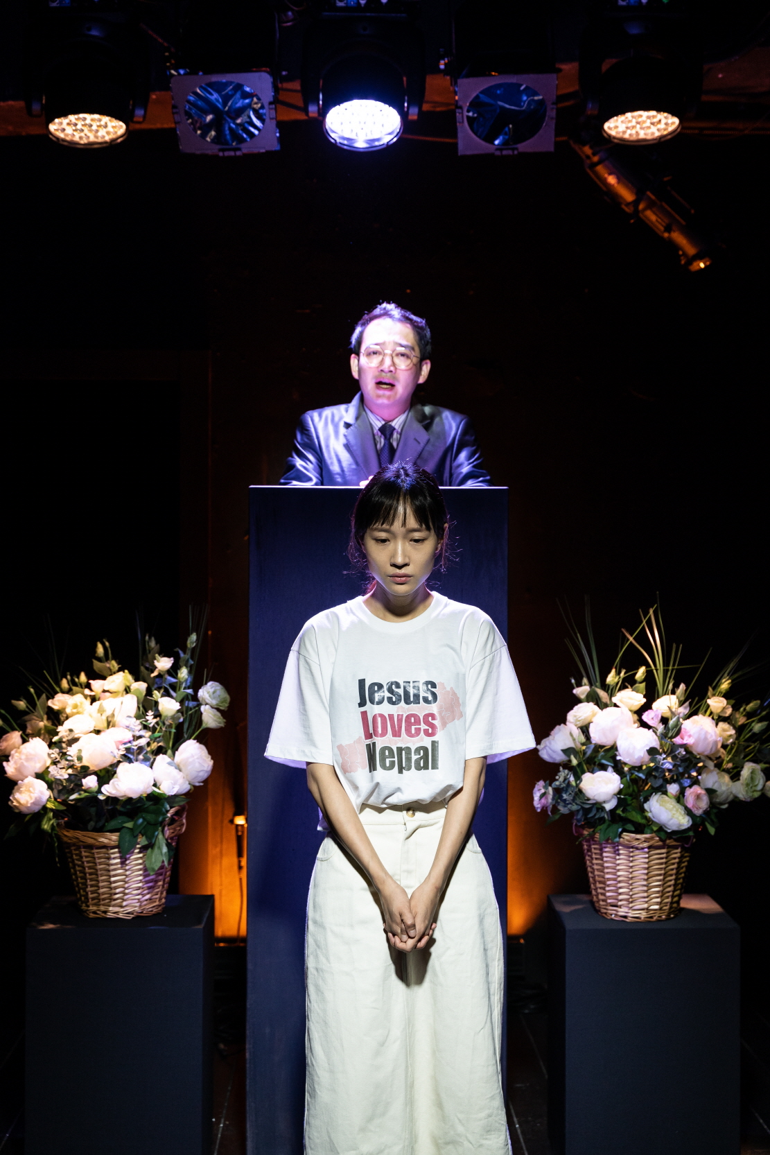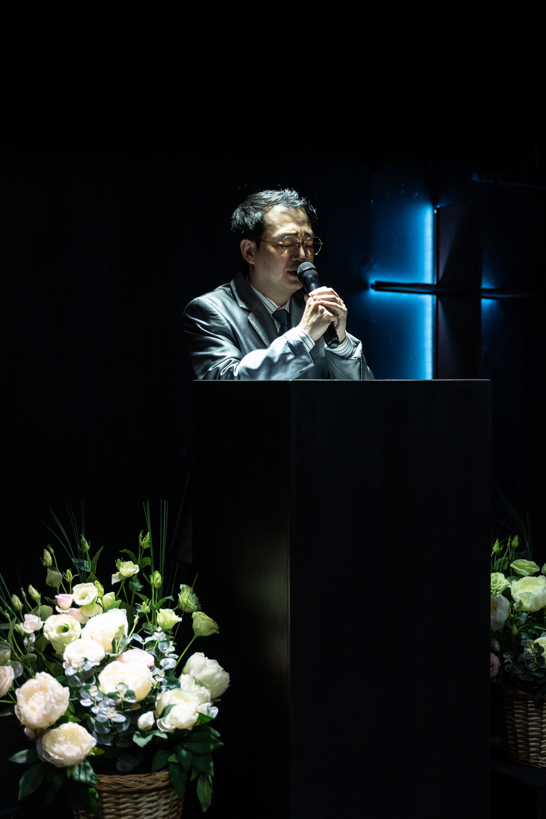 목사 역의 마두영 배우. 한편 관객석을 쳐다보며 관객석으로 청년부에 대한 비판을 연장하거나 그 스스로가 관객의 위치를 전유하는 것과 같이 극은 극장 전체를 교회로 따라서 관객 모두를 시온교회의 일원으로 두려고 한다. 혜인의 비판과 항변은 정치적인 목소리를 부조리한 현실의 주석으로 끼워 넣는 것, 곧 현실 비판적 목소리가 그 현실을 비집고 빠져나오는 것을 보여준다. 일종의 브레히트의 서사극 기법이 차용된 것과도 같은 전환에서, 잘못된 책임 전가와 낙인찍기로 고통받았을 수많은 혜인에 대한 성찰의 목소리를 (우리의 위치의 연장선상에 있던) 혜인의 위치에 다시 돌려주는 것이다.