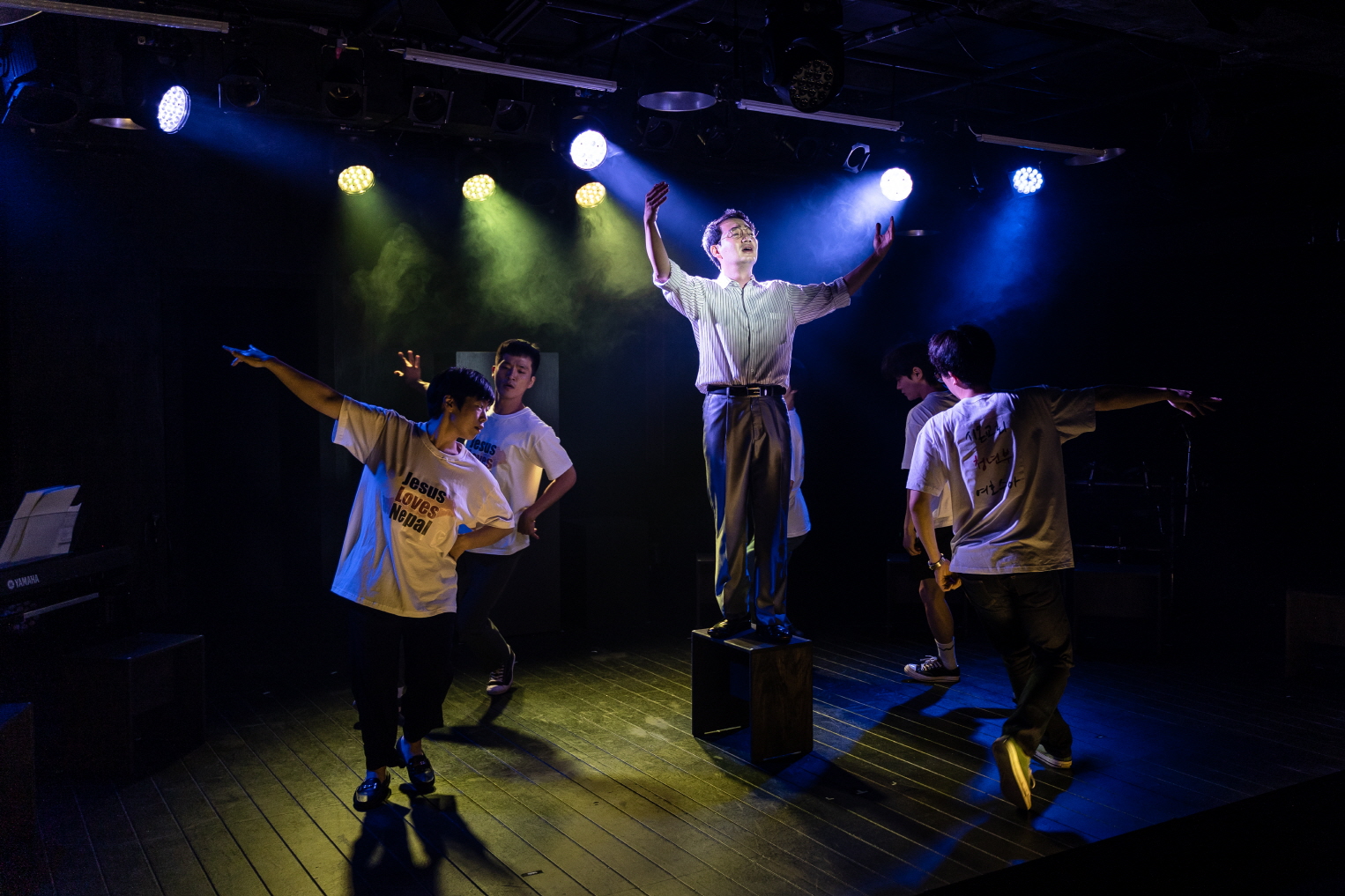 사진 왼쪽부터 시영(이지수 배우), 다영(정은재 배우), 예수(변승록 배우), 전도사(이산 배우). 그럼에도 여러 곡은 차근차근 쌓이면서 사실주의적 구성을 입증하고 또한 배우의 또 다른 능력과 기술적 숙련도를 보여주는 것이면서 나아가 그 자체로 회화의 언어가 아닌, 음악극적인 구성을 통해 극의 다성부를 구성하는 측면이 있다. 이는 서사 자체가 매우 간단하면서 동시에 의도적으로 압축적으로 제시되는 부분과도 관계가 있다. 곧 음악은 형식적인 차원에서 강렬한 록을 구사하기도 하지만, 대체로 언어를 찬송가에 얹힌 정도로 사용된다―〈청년부에 미친 혜인이〉는 여러 음악을 사용하지만, 음악적 색채의 다양함과 음악적 성취, 라이브의 쾌감을 체감할 수 있지는 않다.