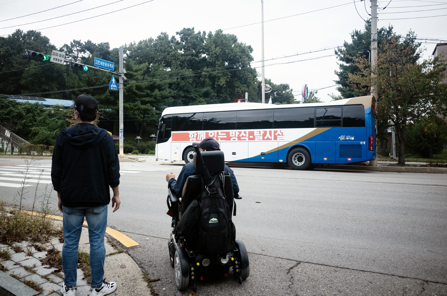 향유의집에 거주했던 김동림 분은 이정하 활동가와 함께 〈관람모드-있는 방식〉의 주요한 배우가 된다. 이룸센터에서 출발 이후 김포장애인자립생활센터를 중간 경유지로 가져가며 김동림을 태우고 도착 이전에 중간에서 김동림의 집을 들른 것은 애초에 전동 휠체어를 수용할 수 있는 버스를 사용함으로써 가능했는데, 이를 통해 김동림을 관객과 같은 위치로 두고자 했다는 것을 알 수 있다. 이러한 장치로부터 장애인을 우리의 현존으로 초대하는 것에서 나아가 우리를 환대하는 주체로 변환한다. 이는 버스 중앙 공간을 극장으로 탈바꿈하는 것, 곧 극장에서 장애인의 극장 접근성의 정도를 측정하고 이를 가시화하는 이전 작업의 연장선상에서 극장의 자리를 구성하는 것이기도 했다. 그리고 여기에는 김동림 자체가 공연의 서사를 지탱하는 강력한 현존이라는 것이 전제된다.