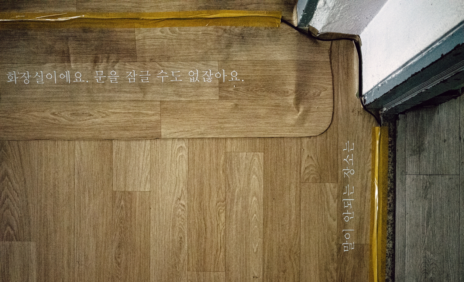 0set 프로젝트, 〈관람모드-있는 방식〉.(이하 상동) 바닥에는 인터뷰의 문장들을 인용해 놓았다. 이러한 문장은 사진과 같이 그 내용에 해당하는 장소를 직접적으로 지시하기도 한다.