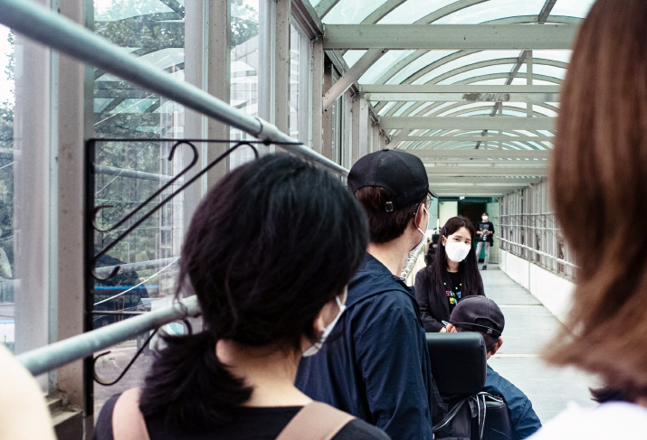 이동―출발과 도착, 그리고 머묾―은 〈관람모드-있는 방식〉의 시작과 끝, 곧 형식적 골자를 이룬다. 출발과 도착의 장소는 같고, 한국장애인개발원이 운영하는, 국회의사당역 앞 이룸센터가 그 장소가 된다. 사실상 여기서 무언가가 진행되지 않지만 이 장소는 공연 자체가 장소의 서사라는 전제에서 텅 빈 기표의 공간을 질문으로 채우게 하는데, 공교롭게도 법을 제정하는 의회와 인접된 곳이라는 점에서, “법”을 키워드로 한 페스티벌의 전체 지향점과 맞물린다. 〈관람모드-있는 방식〉은 법이 있기 전의 장애인 시설에 대한 법적 규정이 미흡했을 때부터, 오늘날 법의 탈시설의 수용과 같이 과거에서 현재로 이어지는 역사의 변곡점에 새겨진 법의 무늬들을 확인할 수 있다.