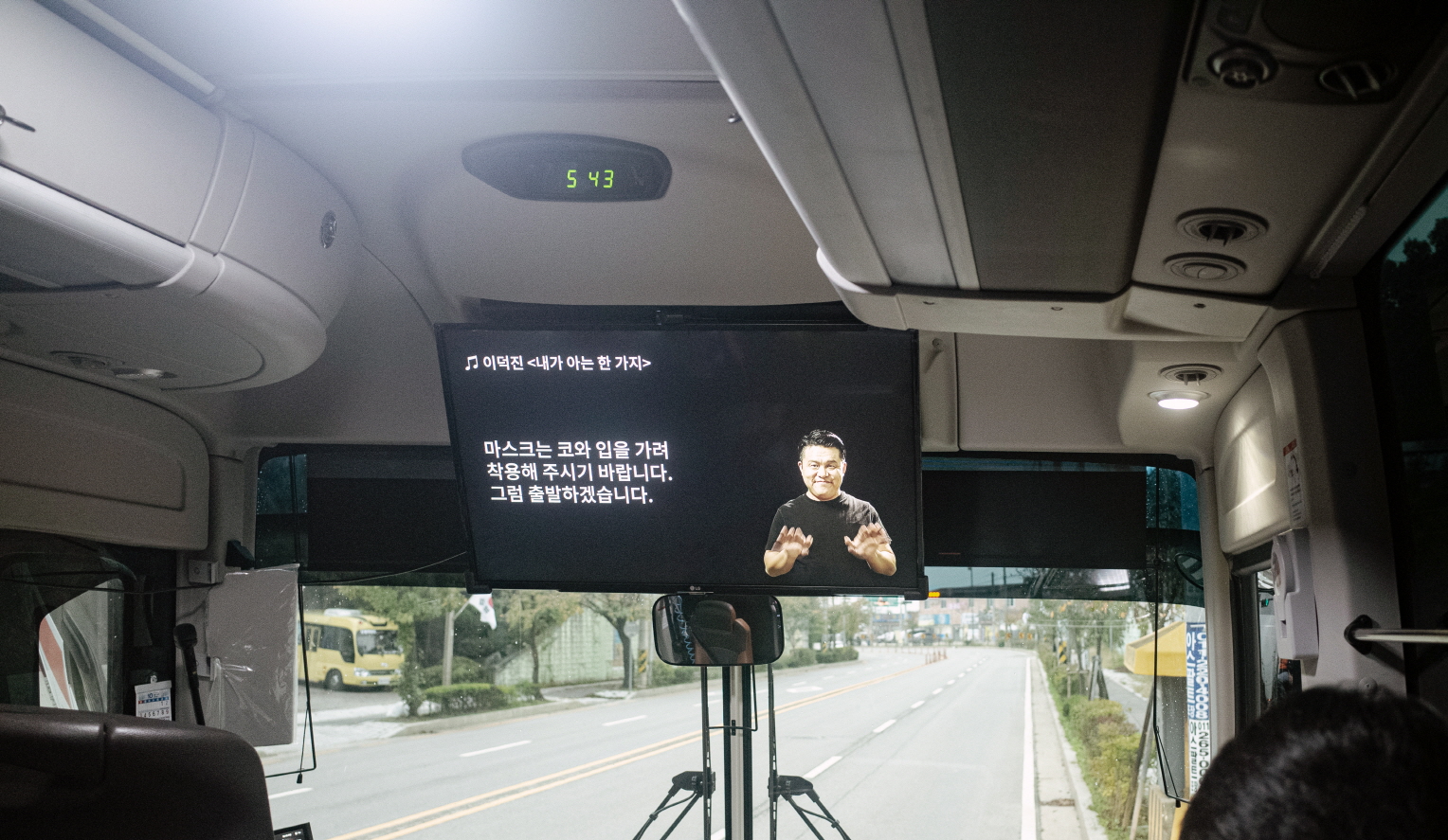 향유의집에 거주했던 김동림 분은 이정하 활동가와 함께 〈관람모드-있는 방식〉의 주요한 배우가 된다. 이룸센터에서 출발 이후 김포장애인자립생활센터를 중간 경유지로 가져가며 김동림을 태우고 도착 이전에 중간에서 김동림의 집을 들른 것은 애초에 전동 휠체어를 수용할 수 있는 버스를 사용함으로써 가능했는데, 이를 통해 김동림을 관객과 같은 위치로 두고자 했다는 것을 알 수 있다. 이러한 장치로부터 장애인을 우리의 현존으로 초대하는 것에서 나아가 우리를 환대하는 주체로 변환한다. 이는 버스 중앙 공간을 극장으로 탈바꿈하는 것, 곧 극장에서 장애인의 극장 접근성의 정도를 측정하고 이를 가시화하는 이전 작업의 연장선상에서 극장의 자리를 구성하는 것이기도 했다. 그리고 여기에는 김동림 자체가 공연의 서사를 지탱하는 강력한 현존이라는 것이 전제된다.