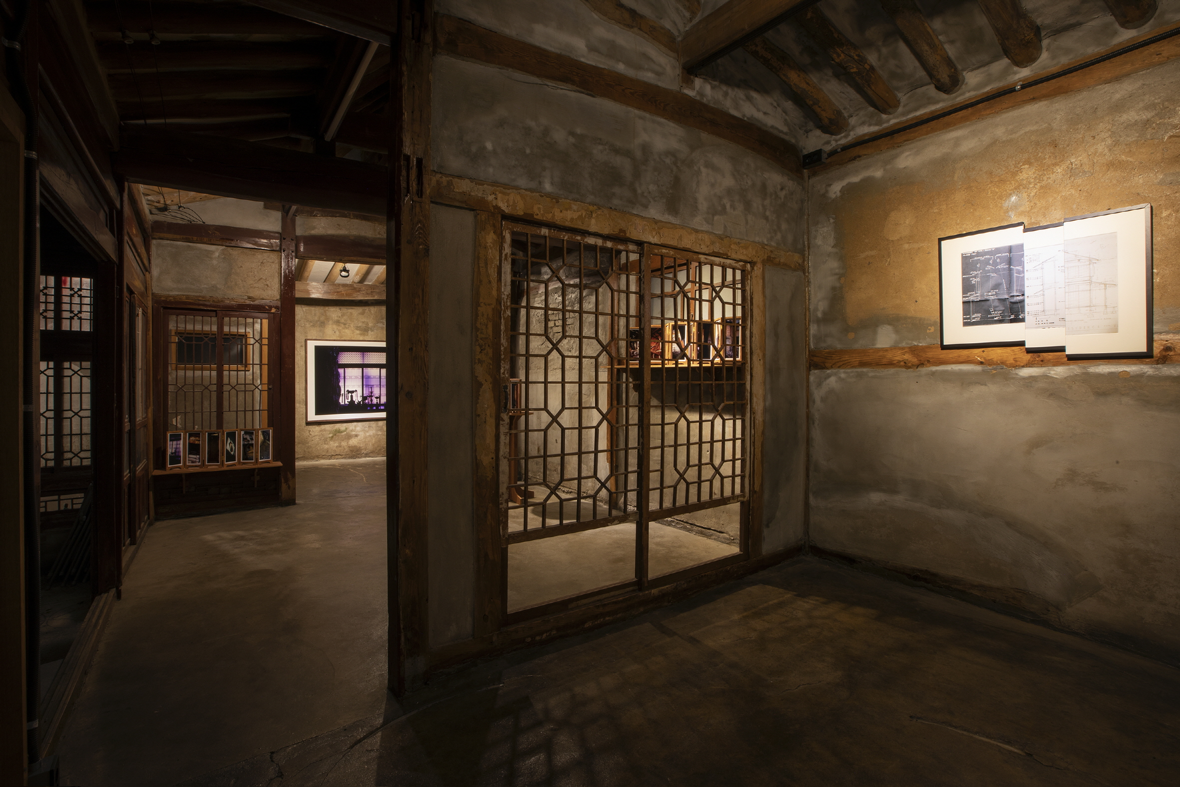 전시 《적산가옥》 전경 ⓒ오석근(이하 상동) 적산가옥이 산재한 동인천 부근에 새롭게 자리한 부연에서 열린 전시 《적산가옥》은 해당 지역의 역사를 현재에 각인시킨다는 점에서 미술 전시로서는 매우 드문 경우다. 세 명의 작가는 이의중 건축가와 같이 현대 미술 작가만으로 구성되지 않았는데, 건축사와 근대사를 연결하는 리서치를 작업으로 연장해 온 카마다 유스케와 실제 『신흥동 일곱주택』이라는 책을 이의중 건축가 외에 여러 작가와 함께 만든 오석근 작가가 참여하며, 건축에 대한 전문성과 실제 경험을 공유하며 전시로 연장할 수 있었다고 보인다. 레퍼런스가 모인 테이블 위에 함께 놓인 『신흥동 일곱주택』은 전시의 밑거름이자 전시를 참조하는 데 도움을 준다.