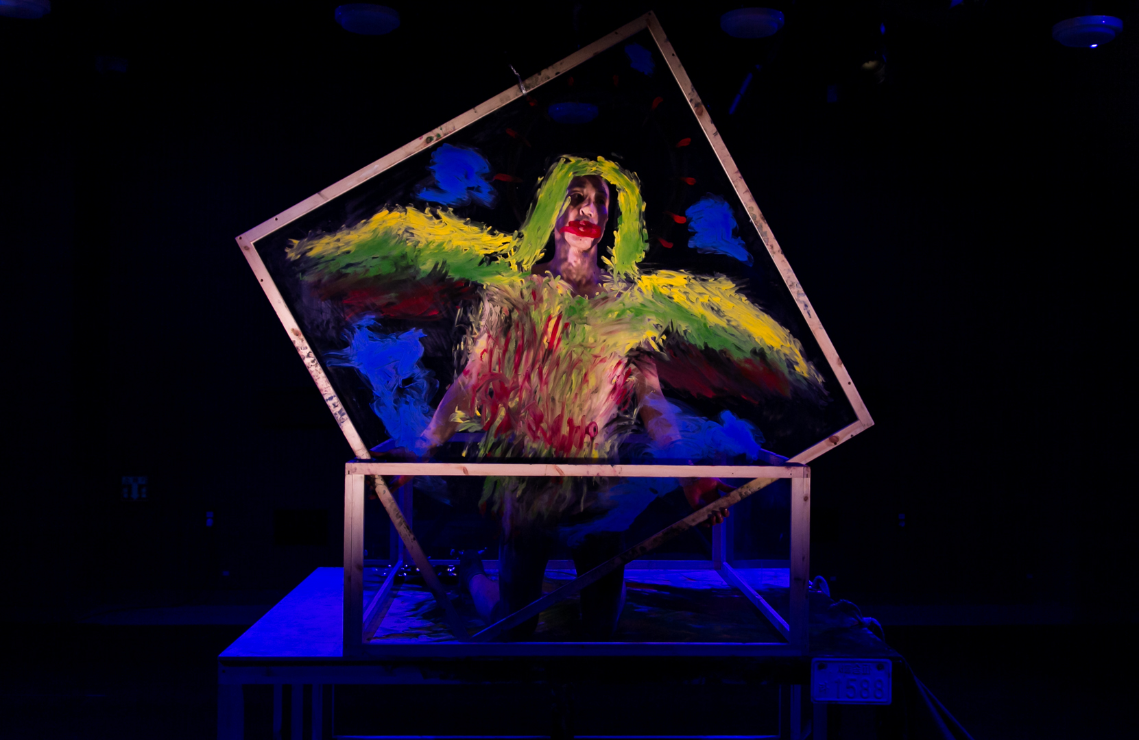 상자를 열고 그림이 천장으로 띄워지며 새의 형상이 분명해질 때 존재는 뒤로 돈 채 얼굴을 새의 얼굴이 있는 자리에 맞춘다. 이어진 날갯짓의 몸짓은 자유를 표상하는 듯하다. 이는 이미 그려져 있는 것이긴 하나 절박한 행위가 생존의 행위가 아닌 심미적 도상을 만드는 행위로 치환되는 건 〈?〉의 주제의식에 가깝다고 보인다. 물론 여기서 금배섭의 행위는 그 자체로 심미적인 차원을 지향하지 않으며, 심오한 무언가를 그리는 주체의 긴장이나 몰입 상태를 재현하지도 않는다. 주목할 수 있는 건 그러한 맹목적인 행위가 심미적 차원으로 접속되는 순간이다.