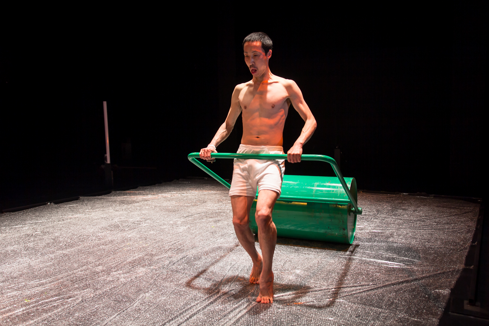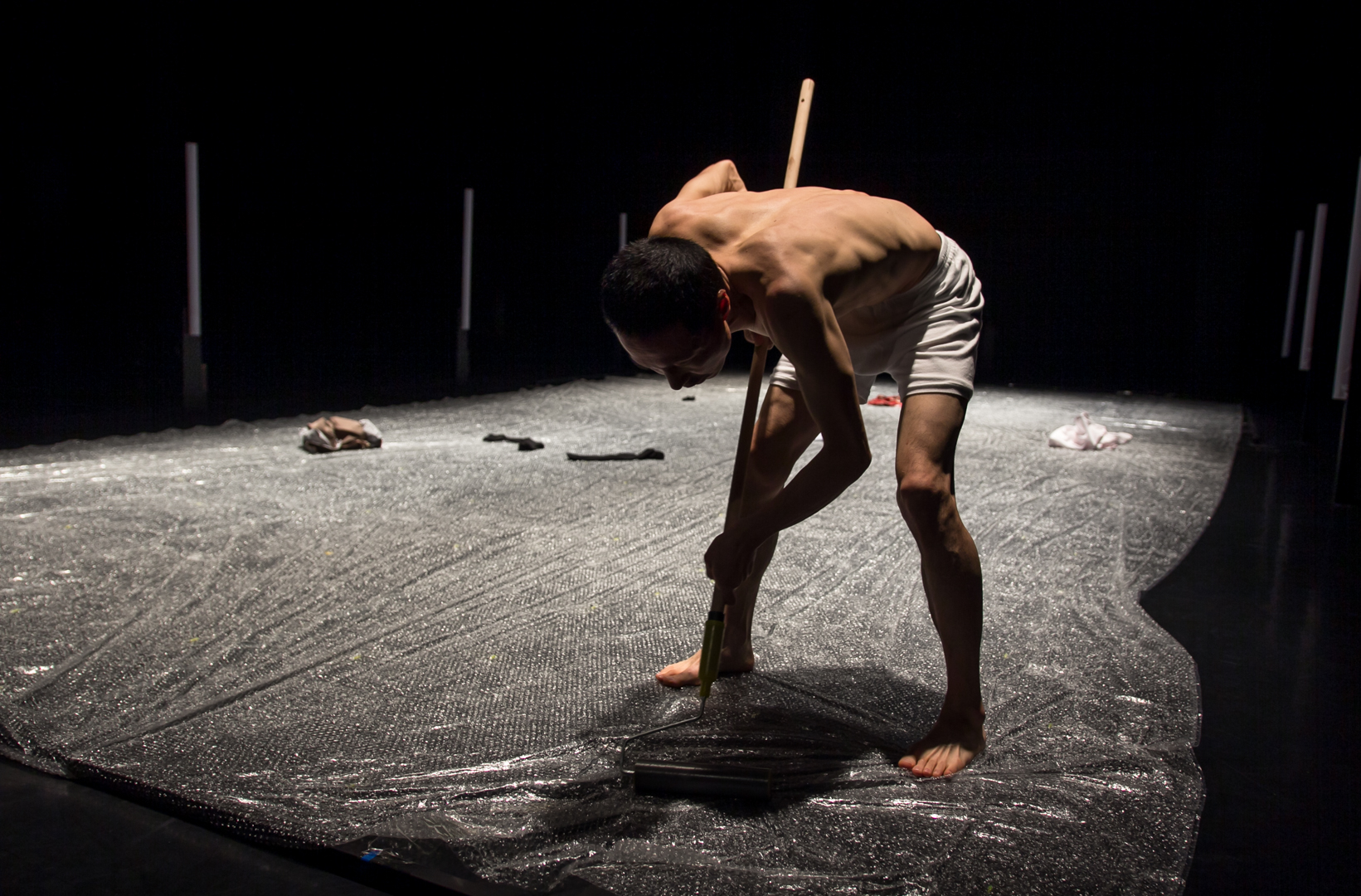 금배섭 안무, 〈?〉 ©박태준. (이하 상동). 집요하게 반복되는 행위로서 움직임은 조명―예컨대 암전―이나 음악의 변화에 따라 단락을 맺는다. 곧 외부 환경의 제어는 한 인물의 내부를 재현하는 대신 (무한한) 반복된 움직임의 단위들로 이어지는 퍼포먼스를 단속적으로 재접속하게 하고 끝내 극적으로 종결짓는다는 점에서 퍼포먼스를 다분히 극적 장면들로 승화한다. 〈?〉은 퍼포먼스적인 한편 시각적 도상을 활용하거나 액션 페인팅의 요소를 일부 사용하는 등 시지각적 차원이 강한데, 무엇보다 그 극의 단위 구성의 차원이 두드러진다. 가령 행위는 장면의 단위에 예속된다.