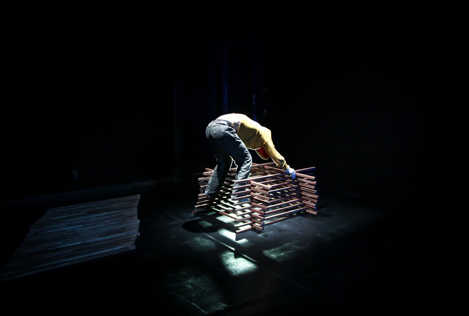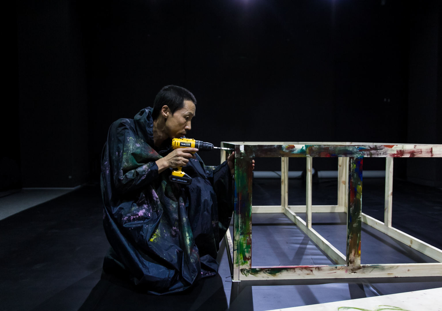 탈북민이 모티브가 된 이 작업에서 차곡차곡 쌓아나가는, 따라서 펼쳐진 나무를 쌓는 나무로 어김없이 변환하는 금배섭의 행위는 노동에 가깝다. 금배섭이 다 쌓인 구조물 안에 들어가 몇 개의 층을 들고 얼굴을 가린 기괴한 생명체의 형상으로, 남은 나무 틀을 발로 밀고 이동하는 과정에서 생겨나는, 다른 존재로의 변환은 판타지처럼 보이지만, 대부분의 움직임은 치장되지 않은, 그러나 빈틈없이 재단된 행위의 양상을 띤다.