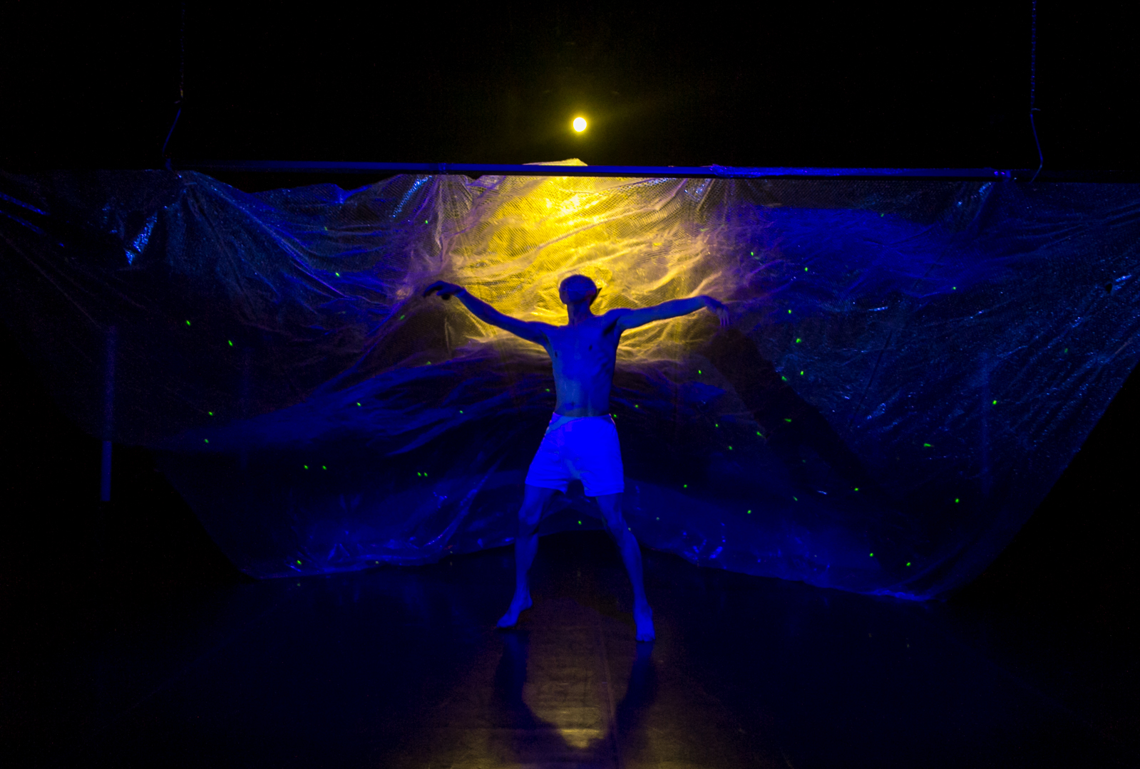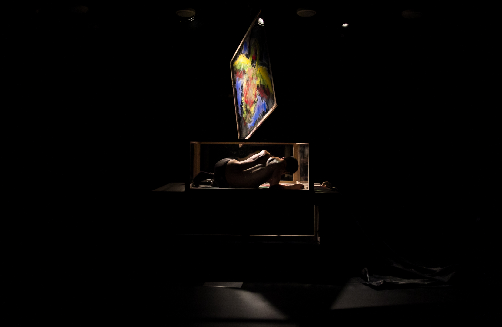 금배섭 안무, 〈?〉 ©박태준. (이하 상동). 집요하게 반복되는 행위로서 움직임은 조명―예컨대 암전―이나 음악의 변화에 따라 단락을 맺는다. 곧 외부 환경의 제어는 한 인물의 내부를 재현하는 대신 (무한한) 반복된 움직임의 단위들로 이어지는 퍼포먼스를 단속적으로 재접속하게 하고 끝내 극적으로 종결짓는다는 점에서 퍼포먼스를 다분히 극적 장면들로 승화한다. 〈?〉은 퍼포먼스적인 한편 시각적 도상을 활용하거나 액션 페인팅의 요소를 일부 사용하는 등 시지각적 차원이 강한데, 무엇보다 그 극의 단위 구성의 차원이 두드러진다. 가령 행위는 장면의 단위에 예속된다.