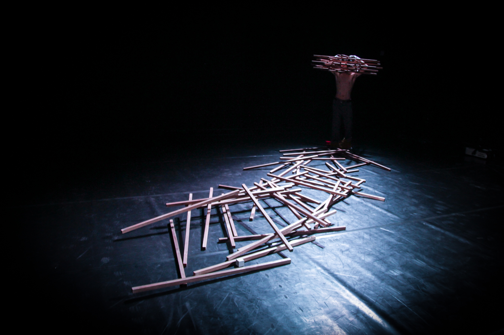 〈섬〉에서 남자가 위치한 장소는 물론 섬임을 나타낸다고 할 수 있을 것이다. 남자는 펼쳐져 있는 각목을 양손으로 각각 네 개씩 잡고 사각형의 형태로 차례차례 쌓는다. 바닥을 헤엄쳐 가고 쭈그려 앉아 잰걸음으로 가기도 하는 등, 무대는 물리적으로 먼 길, 복잡하게 구획된 지형의 장소로 변환된다. ‘섬에서 나가기 위한 배일까.’ 또는 ‘자신의 거주 공간일까.’ 그중 어떤 형태로도 적합하지 않은 이 구조물은 그 자신을 은폐하는 또 다른 섬의 알레고리를 형상화한다.
