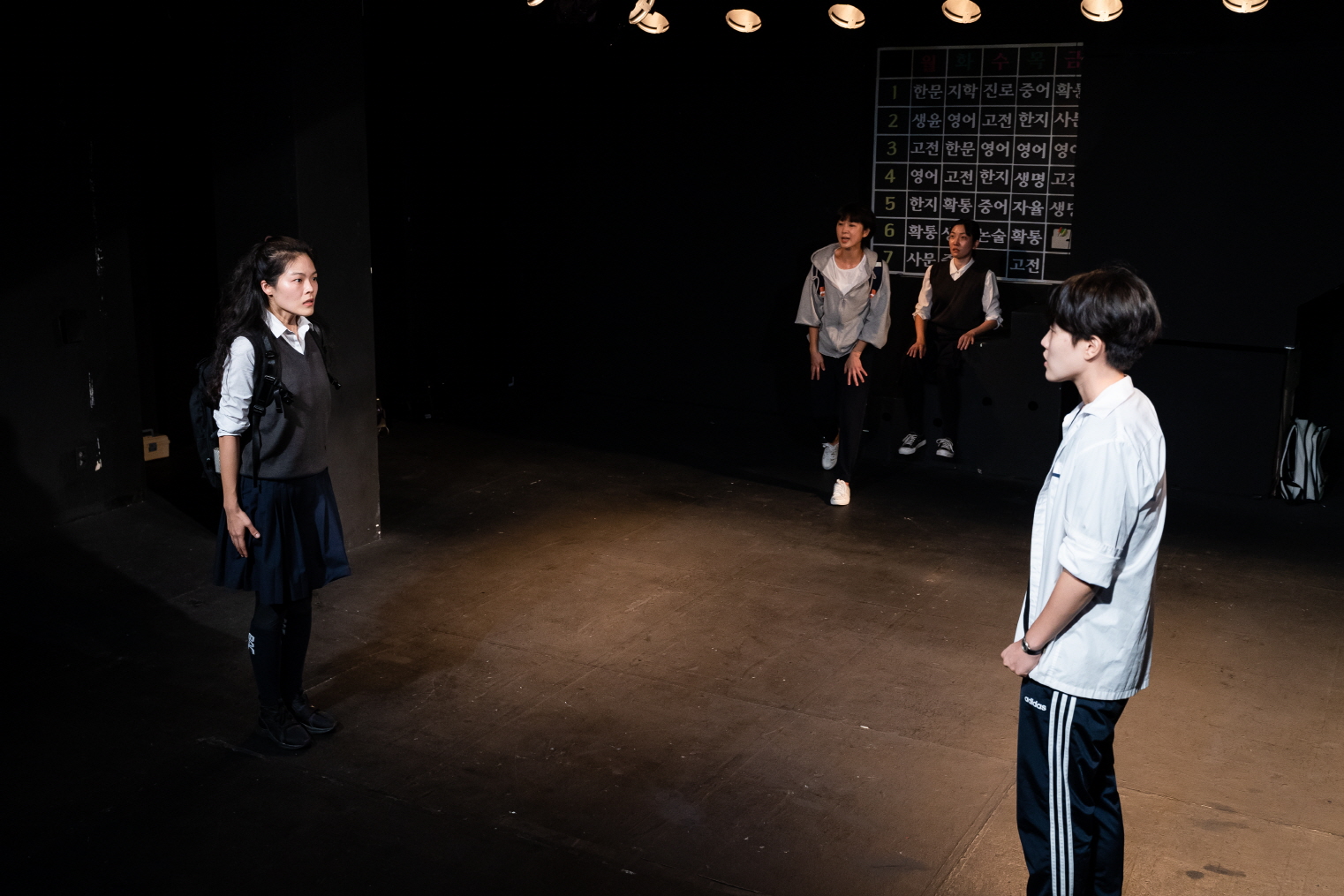 〈제1강: 거절하는 방법〉의 시간이 과거에서 미래로 흐른다면, 그 공간은 끊임없이 자전하는 존재들로 채워진다. 수업 시간표가 쓰인 칠판 하나가 무대 정면에 부착된 채 그 앞으로 계단이 있고, 그 옆으로 댄 합판 옆 아래로 두 사람이 쪼그려 앉아 있을 정도의 움푹 패는 공간이 생긴다. 이 공간이 주로 선주의 방에 대응된다면, 나머지 무대 공간은 운동장으로 기능한다. 이 운동장을 현이 계속 뛰는 것으로, 그리고 거절을 잘 못 하는 그를 대리해주는 미소가 그를 따라 뛰는 것으로, 또 현을 좋아하는 리아가 현과 만나기 위해 틈을 보던 곳으로, 이 넷이 연대하며 같이 뛰는 것으로, 시종일관 〈제1강: 거절하는 방법〉은 달리는 배우들의 모습을 무대로 내세운다. 가령 소극장이 아닌 원형극장의 위치에서 배우들이 정면성의 단면들을 사방으로 분배하고, 공간의 확장을 통해서 달리기에 매끈함을 부여할 수도 있을 것이다.
