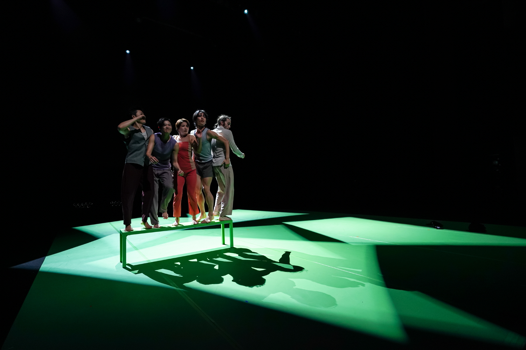 각 장을 하나의 서사 아래 균등하게 분배함으로써 각 장이 그 자체로 고유성을 갖고 사라지는 방식은, 기존 국립현대무용단 예술감독들이 보여준 안무 방식과는 그 결이 다른데, 대부분 대극장을 채우는 대규모 무용수가 동원되는 무대에서 스펙터클한 흐름을 갖는 동시에 일정한 안무의 스타일이 도드라지거나 안무가의 인장이 찍힐 필요가 있기 때문이다. 따라서 군무의 양식을 확립하려 하는 시도가 엿보이게 되는데, 각각 1, 2대 예술감독이었던 홍승엽, 안성수 안무가의 방식이 그러했다면, 그다음의 안애순 예술감독의 안무는 안무가 출현하는 동기와 모티브가 무대에 함께 놓이는, 따라서 무용수들의 즉흥적이고 자유로운 움직임이 유래하는 안무적 착상이 무대를 지배하며 안무가 탄생되는 걸 생생하게 목격하는 데 가깝다고 보였다. 반면 남정호의 안무는 철학적 사유를 무대에 내려놓는 방식으로 보인다. 일종의 가면을 쓴 존재들의 몸짓들이 연극적인 상황에서 펼쳐진다고 할 수 있다. 이는 그 춤의 스타일을 보거나 그 춤이 출발하는 동기를 확인하기보다 그 춤의 외양 뒤의 현실에 대한 질문을 던지는 방식이다. 이 안에서 다양한 몸짓들과 존재들이 탄생하지만, 고정된 서사와 예측된 결말은 현실에 대한 비극적 단면을 확인시키며 몸짓과 존재 들을 상쇄한다.