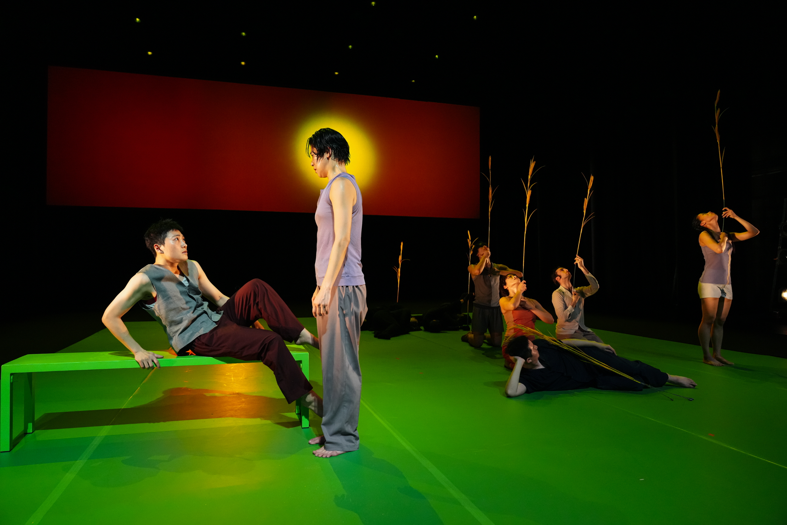 남정호(국립현대무용단 단장 겸 예술감독) 안무, 〈이것은 유희가 아니다〉 ©고흥균 [사진 제공=국립현대무용단] (이하 상동). 〈이것은 유희가 아니다〉는 유희와 그것이 부정되는 과정을 반복하며 진행된다. 초록색 무대에서 열두 명의 무용수는 한 명씩 탈락하고, 탈락의 순간마다 그 초상이 스크린에 뜬다. 그리고 그 가의 색과 같이 검은색 천이 하나씩 깔린다. 검은색의 바깥 영역에 있는 죽음의 사도가 그 역할을 하는데, 탈락한 이들도 그에 합류한다. 하나의 무대는 하나의 음악이 사용되는 독립적 장으로 연출되므로, 각기 다른 무대는 공연의 개별적인 고유의 부분으로 분절되는 한편, 살아남음과 탈락이라는 하나의 서사에 종속된다. 이러한 지점은 서사를 강화하지만, 움직임은 그 서사 바깥으로 나오지 못하는 한계를 보인다. 곧 열두 개의 무대는 각기 다른 음악과 함께 때로는 왈츠와 같은 장르적 움직임을 택하기도 하는데, 각 무대는 탈락될 각 무용수의 움직임에 힘을 실어주며 그 개성을 돋우지만, 움직임 차원에서 각 다른 장들과의 관련을 맺지 못하므로, 단편적으로 무대는 마감되고 소진된다.