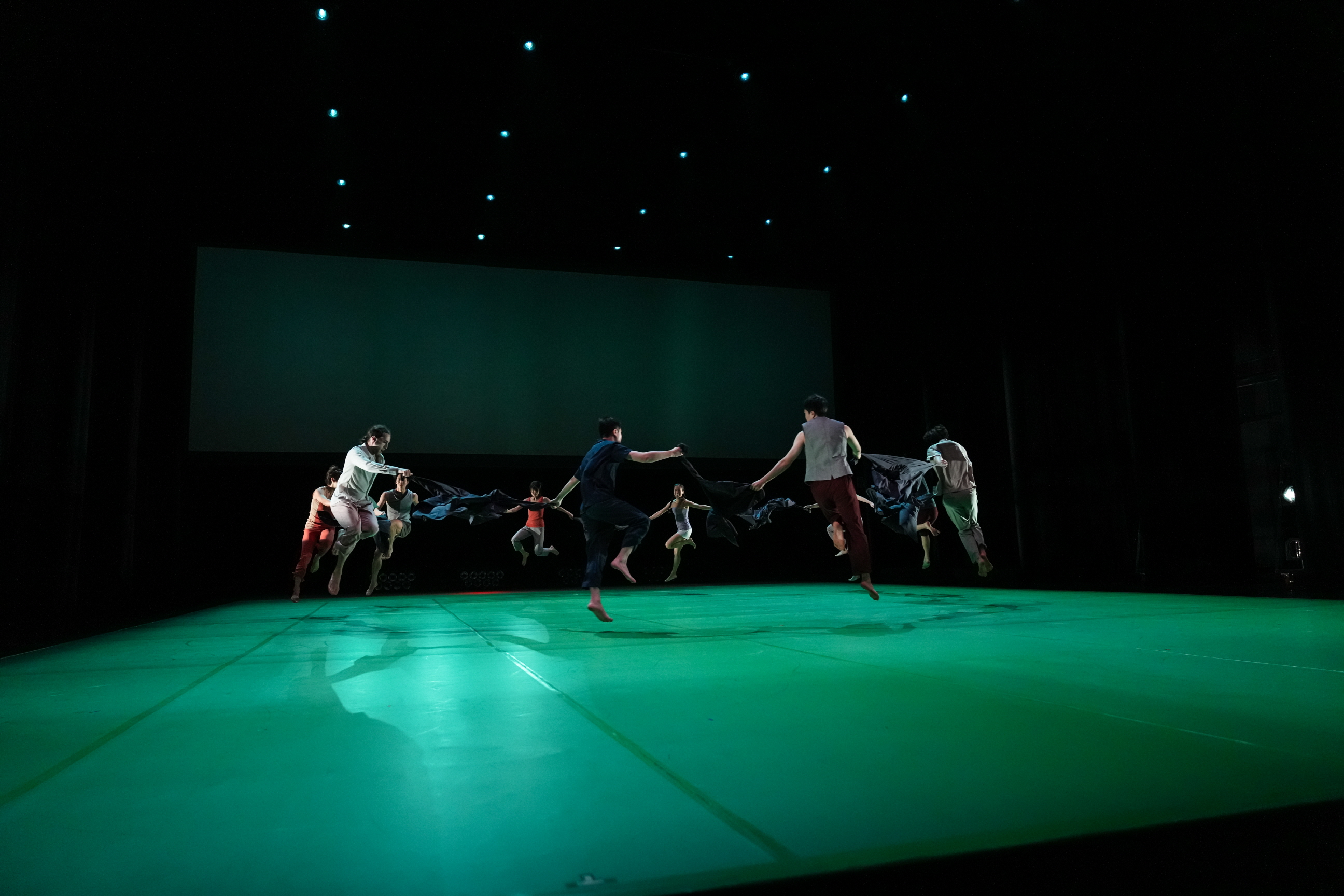 남정호(국립현대무용단 단장 겸 예술감독) 안무, 〈이것은 유희가 아니다〉 ©고흥균 [사진 제공=국립현대무용단] (이하 상동). 〈이것은 유희가 아니다〉는 유희와 그것이 부정되는 과정을 반복하며 진행된다. 초록색 무대에서 열두 명의 무용수는 한 명씩 탈락하고, 탈락의 순간마다 그 초상이 스크린에 뜬다. 그리고 그 가의 색과 같이 검은색 천이 하나씩 깔린다. 검은색의 바깥 영역에 있는 죽음의 사도가 그 역할을 하는데, 탈락한 이들도 그에 합류한다. 하나의 무대는 하나의 음악이 사용되는 독립적 장으로 연출되므로, 각기 다른 무대는 공연의 개별적인 고유의 부분으로 분절되는 한편, 살아남음과 탈락이라는 하나의 서사에 종속된다. 이러한 지점은 서사를 강화하지만, 움직임은 그 서사 바깥으로 나오지 못하는 한계를 보인다. 곧 열두 개의 무대는 각기 다른 음악과 함께 때로는 왈츠와 같은 장르적 움직임을 택하기도 하는데, 각 무대는 탈락될 각 무용수의 움직임에 힘을 실어주며 그 개성을 돋우지만, 움직임 차원에서 각 다른 장들과의 관련을 맺지 못하므로, 단편적으로 무대는 마감되고 소진된다.