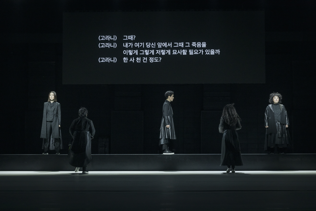 구자혜 작·연출, 〈로드킬 인 더 씨어터〉 공연 사진 [사진 제공=국립극단] (이하 상동) 〈로드킬 인 더 씨어터〉의 시작은 이 작품의 극장과 작품의 구조를 지시하고 장면을 예고한다. 공연의 입구를 확장한 시간은 이 공연의 윤리적 차원이 공연의 형식 자체가 되는 과정의 일환이다. 문자 해설과 수어 통역, 음성 해설이 한 덩어리로 흘러갈 것을 예고하며, 표기법을 통일하고 몇몇 기술을 간략하게 줄이기 위한 절차이기도 하다. 이 공연은 이제 완전히 다른 감각을 가진 존재들과 기존의 일반적 차원으로 간주된 존재들의 동거로서 체험된다.