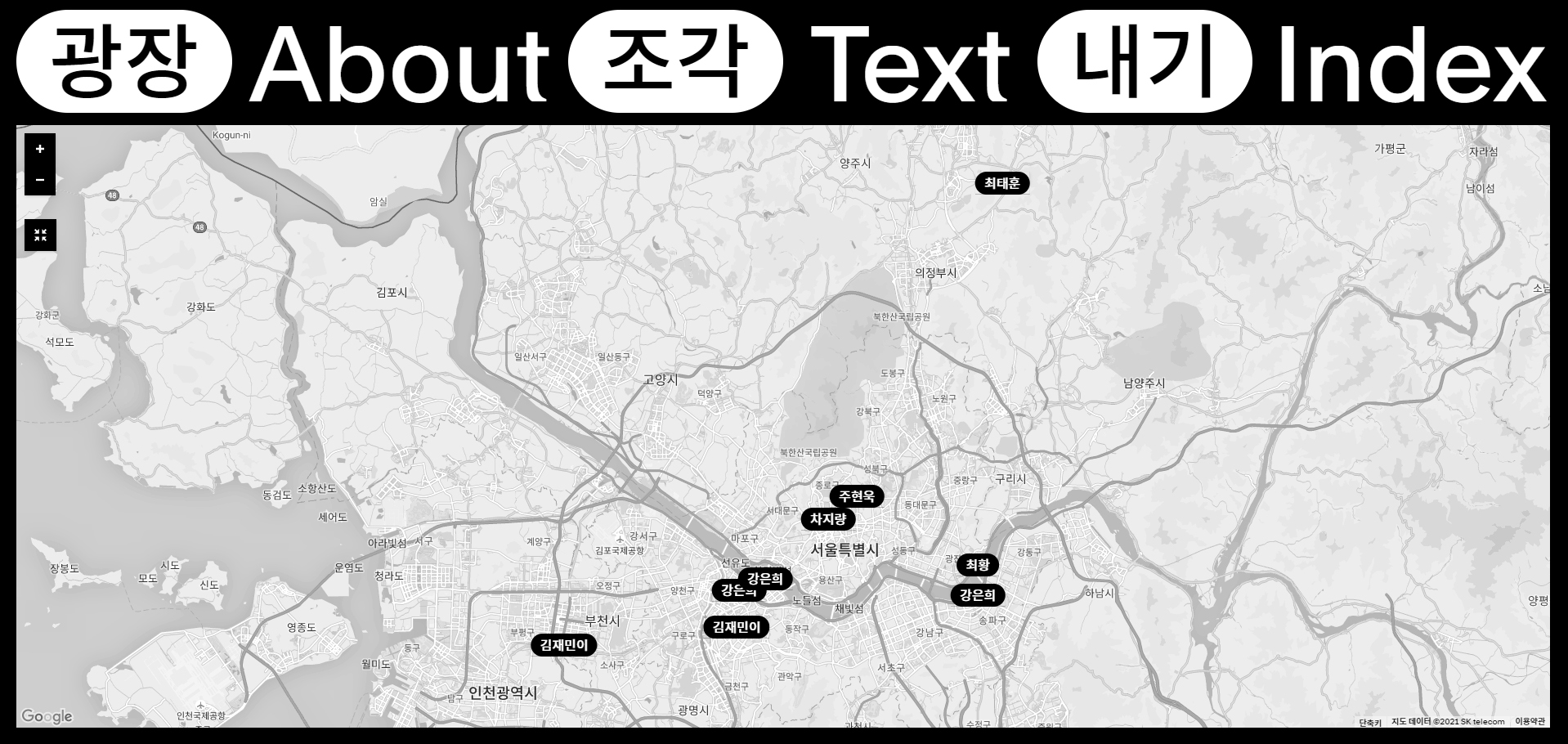 ≪광장조각내기≫ 홈페이지 캡처. 출처=http://seoul25.kr/space/ 얼마 전 ≪서울, 25부작≫의 홈페이지와 관련해 SNS상에서 자그마한 논란이 있었다. 시작은 최황이라는 이름의 작가로, ≪서울, 25부작≫의 웹사이트가 자신이 기획하고 작가로 참여한 ≪광장조각내기≫와 “아이디어와 보여주는 형식”이 몹시 유사하다는 것이 이유였다.1 ≪서울, 25부작≫의 웹사이트는 미술계 일을 꽤 많이 맡아서 하는 것으로 알려진 디자인 스튜디오인 일상의실천이 만든 것으로, 공교롭게 일상의실천은 ≪광장조각내기≫ 웹사이트의 디자이너이기도 했다. 흥미롭게도, 일단, 최황은 일상의실천이 아니라 ≪서울, 25부작≫의 실무자를 비판의 대상으로 삼았는데, 아마 ≪광장조각내기≫의 웹사이트의 제작자가 일상의실천으로 동일하므로 표절까지 가기에는 무리라고 생각했기 때문일 테다.2 그러다 약 4시간 뒤 최황은 생각을 바꾼다. 자신의 SNS 계정에서 최황은 ≪서울, 25부작≫이 웹사이트뿐만 아니라 전시의 주제나 형식까지 모두 유사하다고 판단하여, “창피한 줄 압시다”라는 문장을 필두로 본격적인 비판을 시작한다.3
