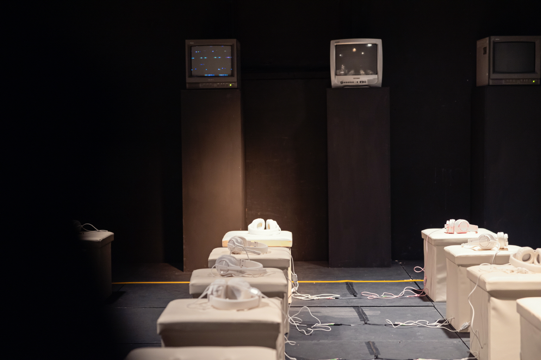 먼저 입방체로 구획된 무대에 종횡으로 빽빽하게 놓인 큐브들 위에 관객은 앉는다. 그 앞뒤 간격은 좁으며, 이후 몸을 틀어 뒤를 볼 때 옆의 관객이 곁으로 인식되는 조건으로 연장된다. 큐브에 앉고 그 옆에 걸린 헤드폰을 끼고 음성을 순전히 거기에 의존하게 된다. 이는 헤드폰 바깥으로 들리는 소리를 차단하며 소거하고 감축하는 효과로 이어진다. 이러한 조건이 전적으로 침범받게 되는 것은 헤드폰의 음향이 꺼지고, 뒤에서 관객을 부르는 소리가 들릴 때부터이다.