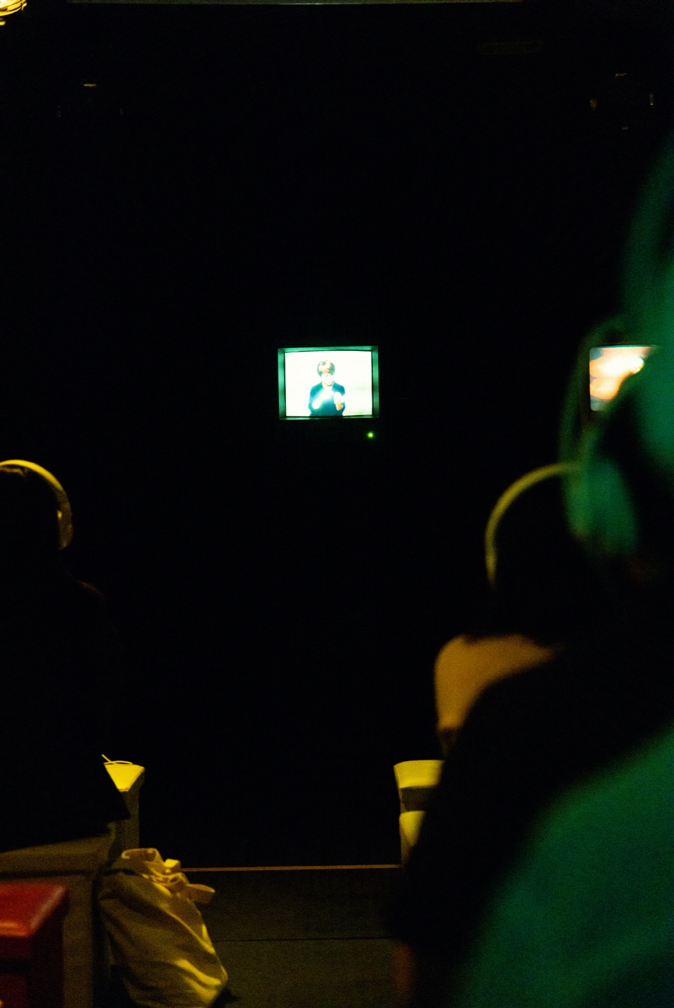 전쟁을 두 남녀의 전쟁으로 정의하면서, 그러한 관계의 끝없는 논쟁을 풀 수 있는 실마리를 한 사람이 더 개입하는 것으로 놓는 일련의 언어 다툼은 언어유희에 가깝다. 부조리극을 상기시키는 이와 같은 언어는 작은 모니터 안에 갇힌 배우들의 인공성을 보여주는 데 더 가까워 보인다. 헤드폰은 처음에 장비 테스트를 넘어 일종의 청력 테스트를 거치는데, 곧 소리가 들리는지 여부에서 나아가, 왼편과 오른편의 소리를 각각 들려주며 우리를 테스트한다. 이러한 신체 테스트는 사실 관객 편의를 위한 차원보다는 통일된 세팅 값을 표준으로 놓고 우리가 그 표준에 속하는지 아닌지를 검토하는 것으로 보인다. 그렇다면 이러한 통일화된 매체를 거친 듣기의 방식은 왜 채택되었을까.
