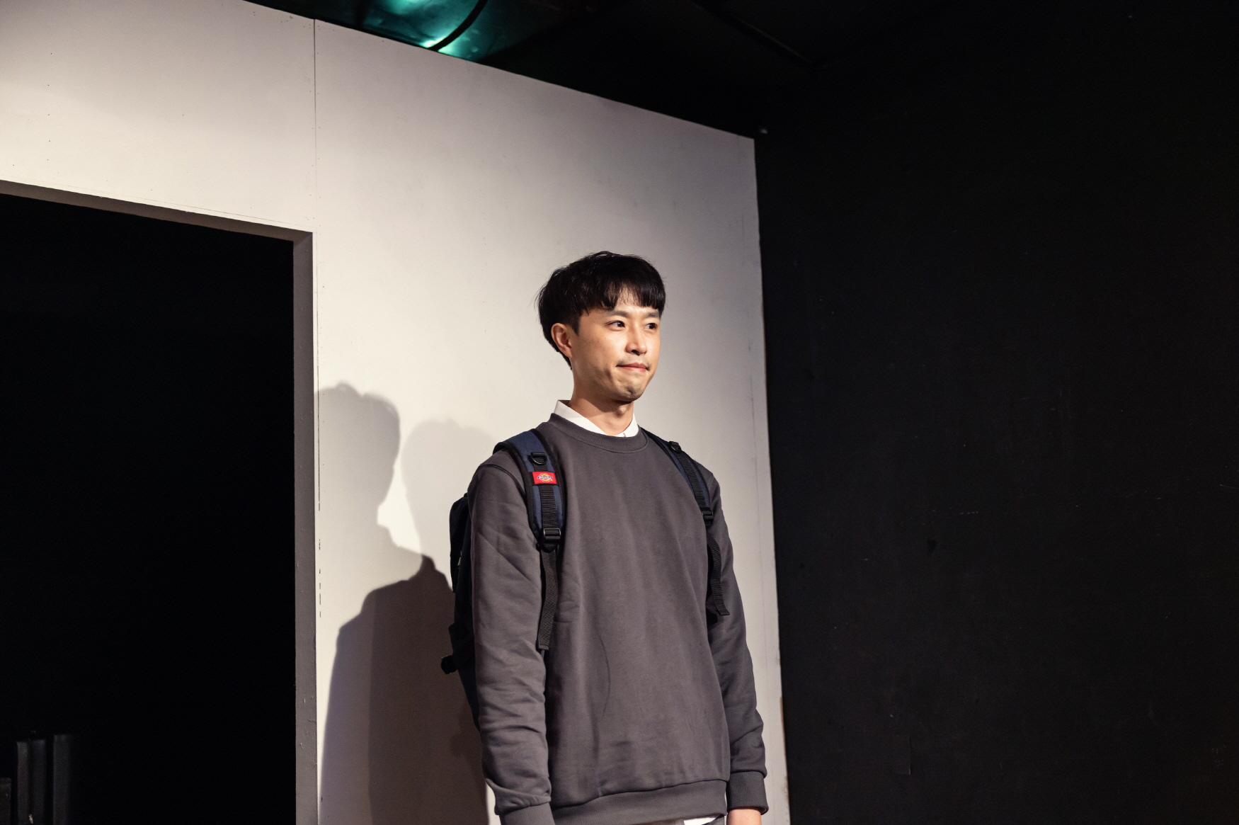 처음의 객석 위치의 뒤편에 위치한 무대에 선 조의진 배우. 관객은 처음에 입구를 거쳐 두 문 중에서 한 문을 열고 들어가게 된다. 문은 관객 한 명 한 명을 센서로 감지해 “삑” 소리와 함께 통과시킨다. 반면 배우는 또 다른 문에서 보이지 않게 등장해 또 다른 문으로 나간다. 이러한 문은 뒤돌아봄을 통해 배우에서 연장된 풍경에서 인지되는 바다. 곧 문지기의 말이 트릭이었음을 드러내는 메타포로 이러한 무대 장치가 구축된 것일까. 문이 애초에 없다면, 또는 하나라면 당연히 문을 여는 데 질문이 들지는 않았을 것이다. 그리고 이미 들어오며 간파된 문을 통해 나가는 것은 그 문의 의미를, 앞서 등 돌린 모니터의 숫자처럼 비루한 것으로 지시한다.