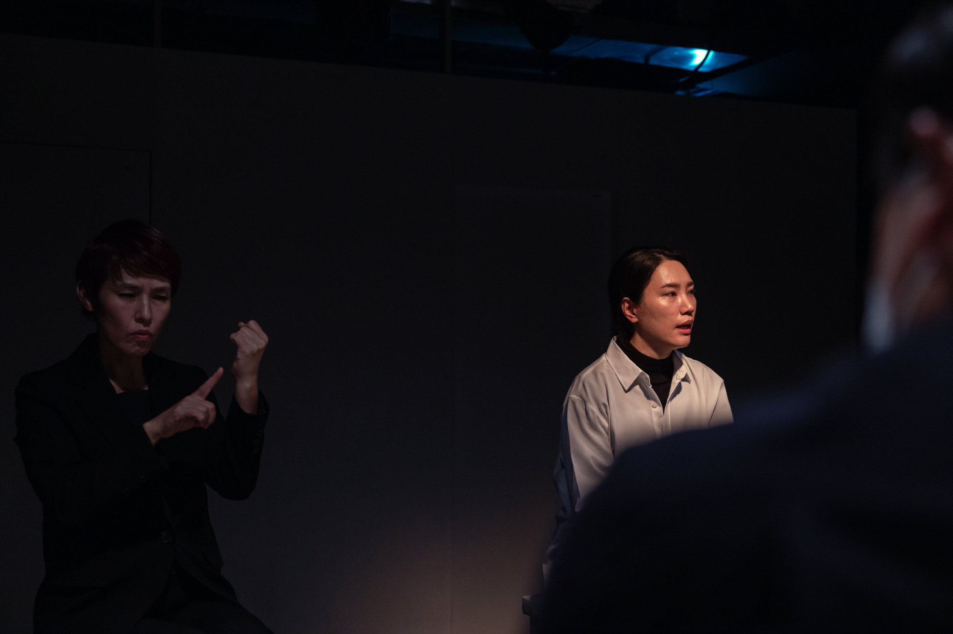 (사진 왼쪽부터) 고경희 수어통역사, 김원정 배우. 바깥을 차단하는 헤드폰을 기어코 벗겨내는 건 모니터에 등장하던 여자 배우의 목소리다. 모니터는 장이 다음으로 넘어갔음을 알려주는데, 모니터와 배우 사이에서 관객의 시선은 경계에 걸쳐진 상태가 된다. 따라서 모니터의 숫자는 미약한 지위를 획득한다. 화면의 규약과 화면에의 규율이 벗겨지는 형태, 곧 공연의 급격한 변화의 기점이 타자의 목소리를 형상화하려는 시도에서 시작됨은, 여자(김원정 배우)―부조리극이 흔히 그러하듯 모니터상의 부조리극에서 연장된 무대에서 성별 말고는 역할을 명명할 근거가 없다. 이는 오히려 퀴어적 성의 존재와 함께 남성, 여성, 제3의 성의 구별을 강화한다.―가 당신이 불편하지 않으며, 당신 역시 나를 불편할 필요가 없다는 식의 대사에서 분명해진다. 그 말의 내용뿐만이 아니라 그 말을 하는 배우의 분위기에서 이러한 말의 내용은 조금 더 모호해지는 바 있다. 연장되는 언어 실험의 형태에서 이 말을 하는 화자의 정체성을 파악할 수 있는 단서는 어디에도 없기 때문이다. 그리고 이는 혼란스러운 배우의 등장 이후 정위할 수 없는 객석의 혼란과도 연관된다.