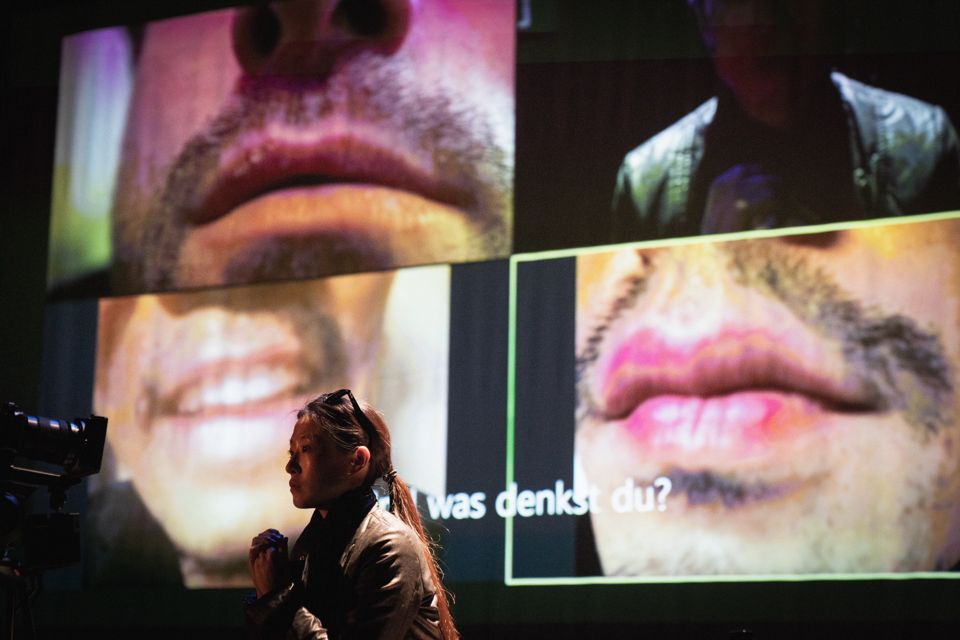 화면 중앙은 배소현 배우, 스크린에서 좌측 상단부터 시계 반대 방향으로 플로리안 야르, 우범진, 장성익, 나경민 배우. 오로지 무대에 혼자 존재하는 배소현은 기록된 영상의 재생에 일일이 리액션을 한다. 이는 동시간의 현장을 무대로 접속하는 것으로 연결되며, 모두 함께 하는 커튼콜을 숫자를 세며 일종의 지휘로써 가져가는 역할로도 이어지지만, 그의 역할은 전반적으로 관객의 입장을 대신하거나 선취하는 데 있다(따라서 그 피드백은 다분히 계도적인 것으로 다가온다―관객의 그것보다 더 과장되거나 과잉되어 있다.). 또는 독일어를 배우고 싶어졌으며 단독 카메라로 독일어 알파벳 발음을 a부터 z까지 하는 것을 보여주고, 영어로 통역의 역할을 중간에서 했고 이것이 현장으로도 이어지며 확인되는 가운데, 그가 무엇보다 난민의 언어를 재현하고 체화하려는 노력에 이르면, 예술가의 욕망은 개인적이기보다 너무 투명하게 사회적인 것으로 변환되기에 이른다, 단순히 어떤 언어 성애자 또는 언어 능력자로서 정체성을 보여주는 것이 아니라.