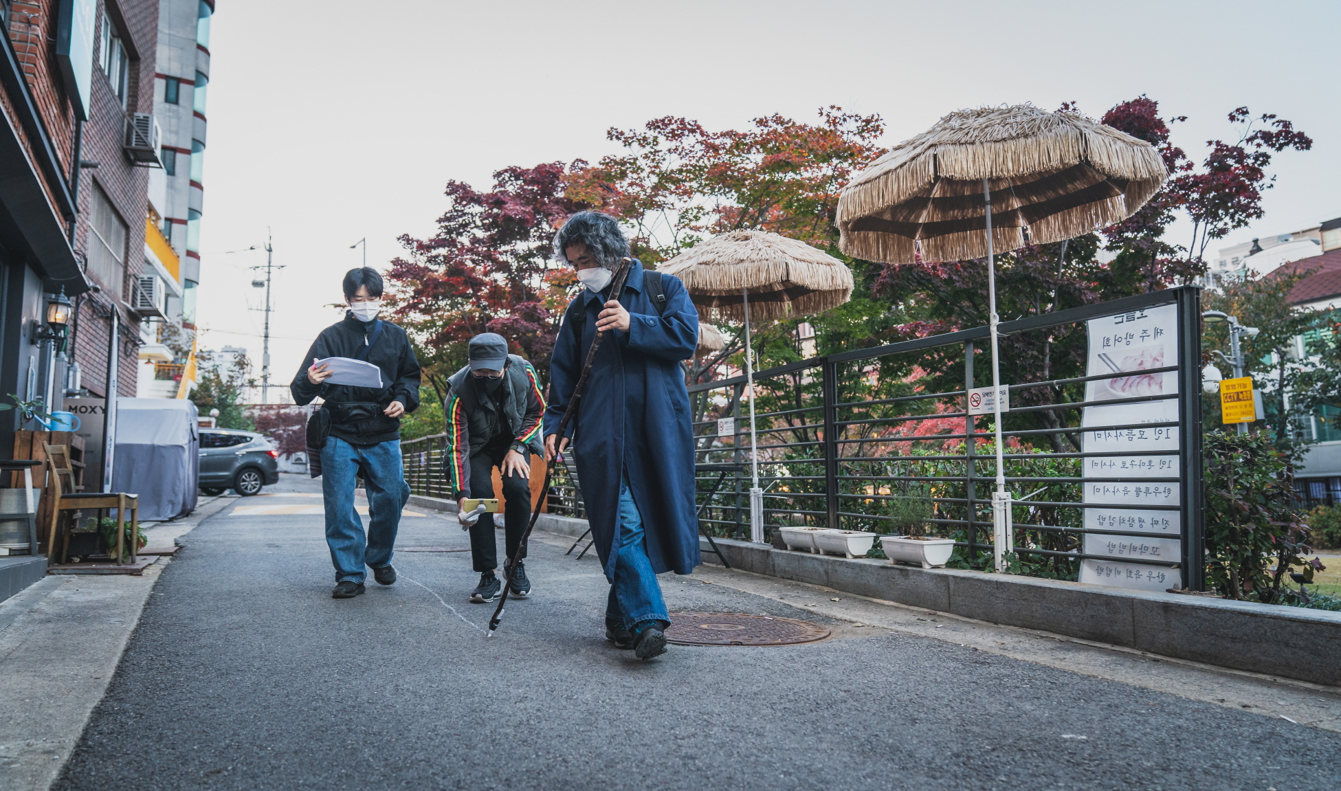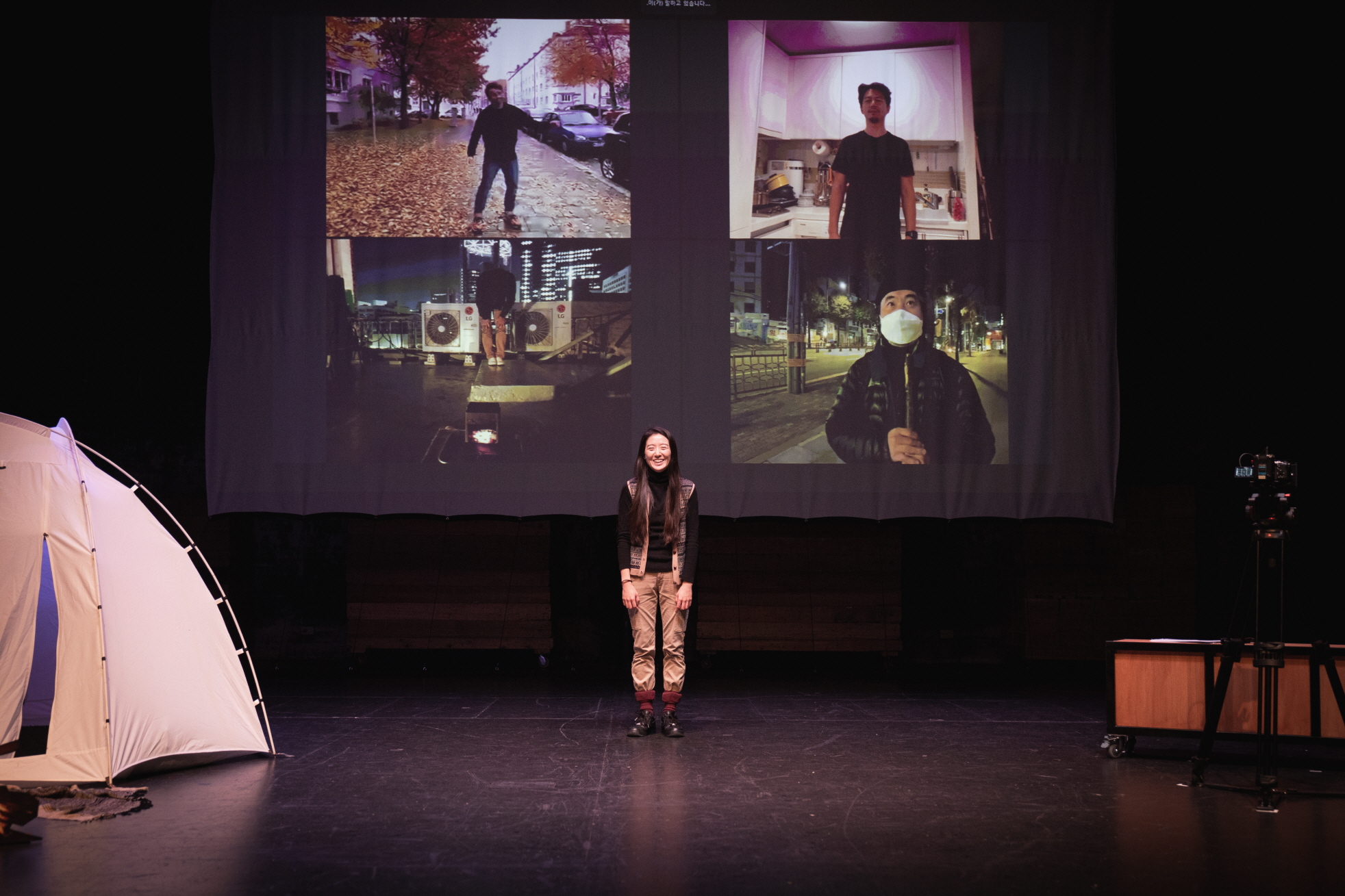 사진 오른쪽은 우범진 배우. 공연 바깥 현장은 공연으로 중계되고, 사실상 카메라 바깥 영역을 보여주지는 않는다. 이를 또 다른 카메라가 찍은 사진이다. 뮌헨으로 이사해 거주 중인 동독 출신의 배우 프롤리안 야르, 공연 후반부 극장에 진입하기까지 길에 분필로 선을 그으며 오는 장성익 배우, 무대에 계속 있는 배소현 배우, 종각역 근처의 종로타워가 바라다보이는 어느 건물 옥상에서 불을 피우고 있는, 시종일관 탈북민을 연기하는 우범진 배우, 그리고 자기 집에서 비교적 자유롭게 있는 나경민 배우까지 배우들은 단지 남과 북의 경계를 다루는 것을 넘어, 통일 이후 동독과 서독 사람들의 삶의 변화를 보여주는 배우들은 다양체의 군집을 이루며, 간헐적으로 송수신한 기록들을 연극은 나열한다.