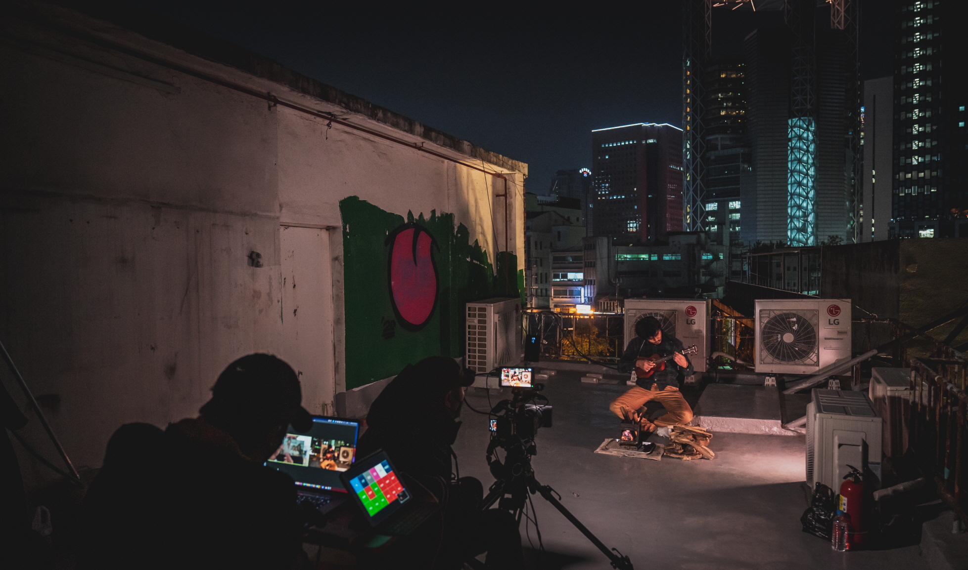사진 오른쪽은 우범진 배우. 공연 바깥 현장은 공연으로 중계되고, 사실상 카메라 바깥 영역을 보여주지는 않는다. 이를 또 다른 카메라가 찍은 사진이다. 뮌헨으로 이사해 거주 중인 동독 출신의 배우 프롤리안 야르, 공연 후반부 극장에 진입하기까지 길에 분필로 선을 그으며 오는 장성익 배우, 무대에 계속 있는 배소현 배우, 종각역 근처의 종로타워가 바라다보이는 어느 건물 옥상에서 불을 피우고 있는, 시종일관 탈북민을 연기하는 우범진 배우, 그리고 자기 집에서 비교적 자유롭게 있는 나경민 배우까지 배우들은 단지 남과 북의 경계를 다루는 것을 넘어, 통일 이후 동독과 서독 사람들의 삶의 변화를 보여주는 배우들은 다양체의 군집을 이루며, 간헐적으로 송수신한 기록들을 연극은 나열한다.