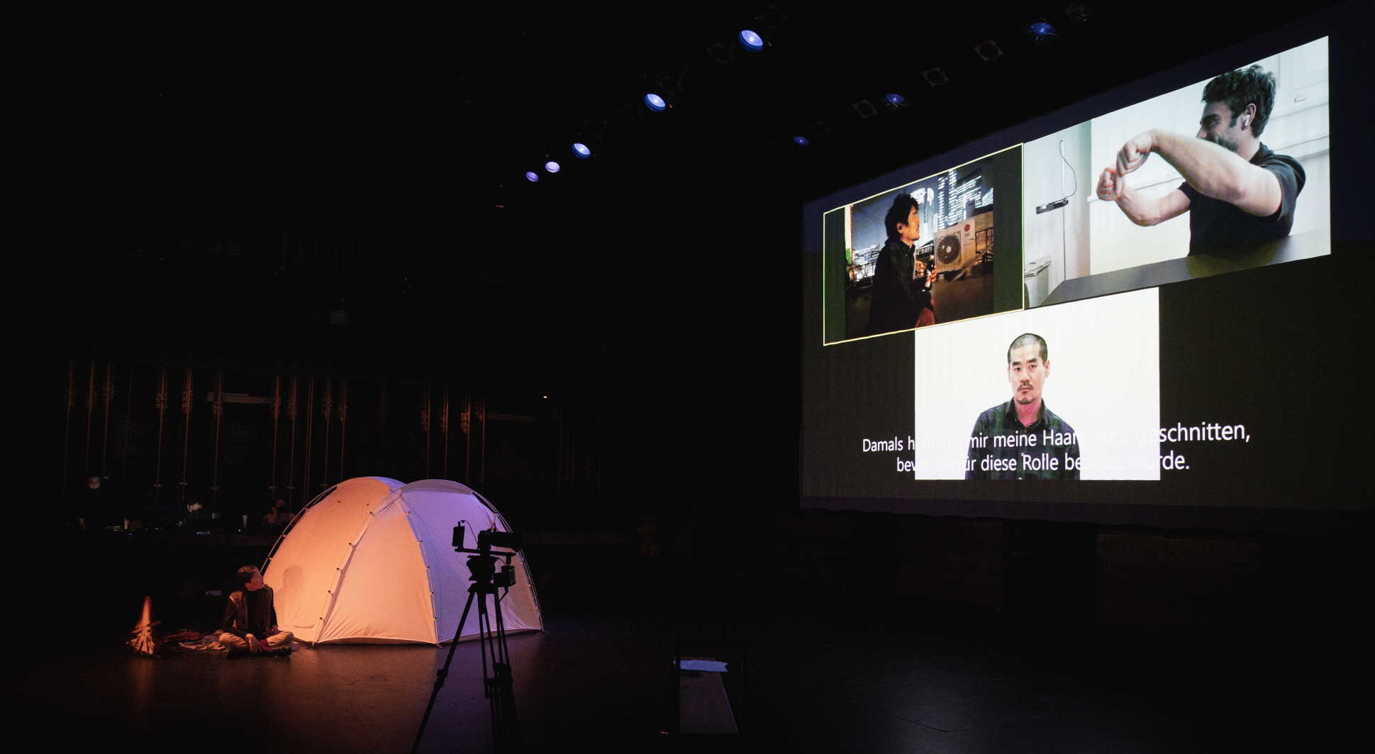 화면 중앙은 배소현 배우, 스크린에서 좌측 상단부터 시계 반대 방향으로 플로리안 야르, 우범진, 장성익, 나경민 배우. 오로지 무대에 혼자 존재하는 배소현은 기록된 영상의 재생에 일일이 리액션을 한다. 이는 동시간의 현장을 무대로 접속하는 것으로 연결되며, 모두 함께 하는 커튼콜을 숫자를 세며 일종의 지휘로써 가져가는 역할로도 이어지지만, 그의 역할은 전반적으로 관객의 입장을 대신하거나 선취하는 데 있다(따라서 그 피드백은 다분히 계도적인 것으로 다가온다―관객의 그것보다 더 과장되거나 과잉되어 있다.). 또는 독일어를 배우고 싶어졌으며 단독 카메라로 독일어 알파벳 발음을 a부터 z까지 하는 것을 보여주고, 영어로 통역의 역할을 중간에서 했고 이것이 현장으로도 이어지며 확인되는 가운데, 그가 무엇보다 난민의 언어를 재현하고 체화하려는 노력에 이르면, 예술가의 욕망은 개인적이기보다 너무 투명하게 사회적인 것으로 변환되기에 이른다, 단순히 어떤 언어 성애자 또는 언어 능력자로서 정체성을 보여주는 것이 아니라.