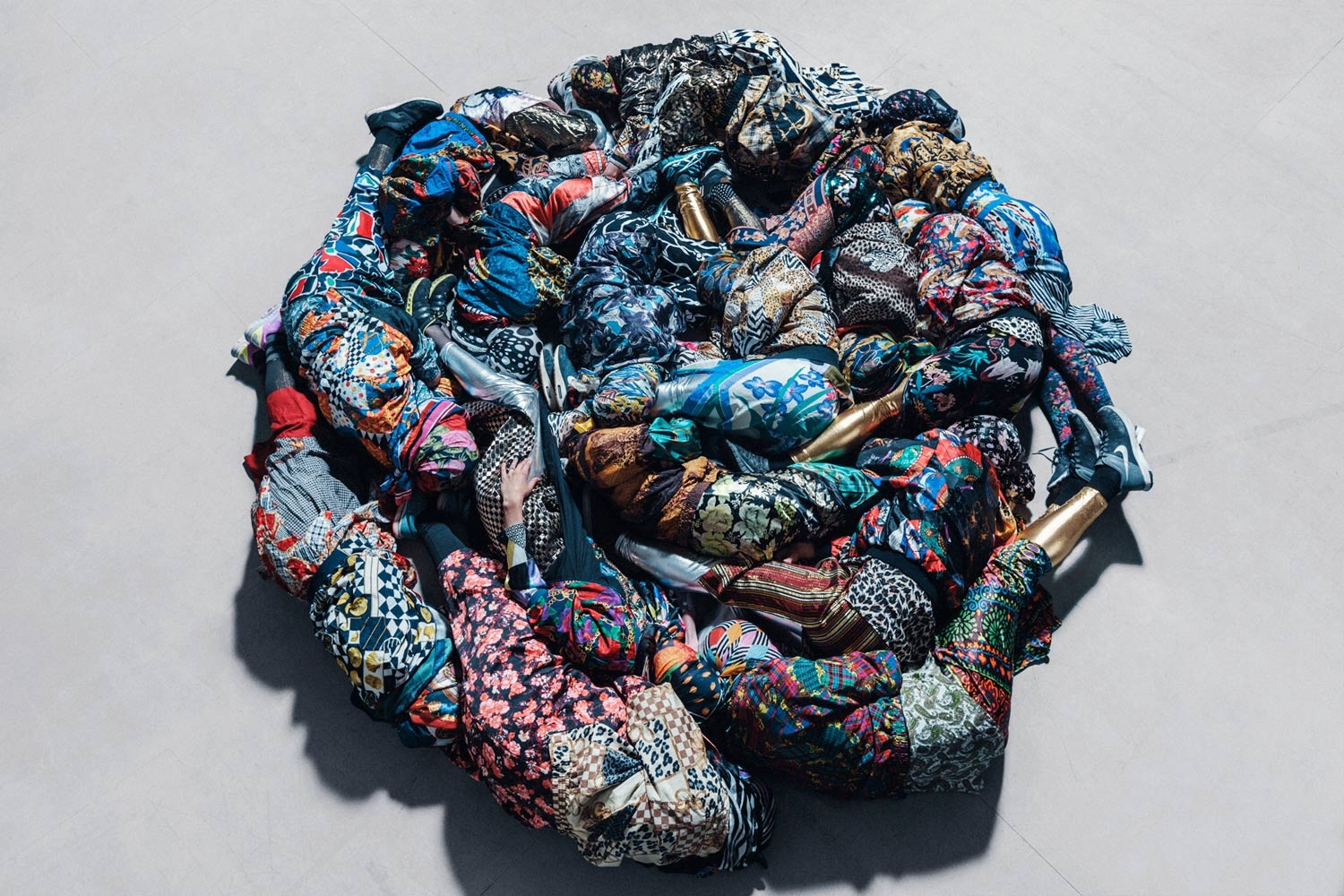 잉그리 픽스달(Ingri Fiksdal), 〈내일의 그림자(Shadows of Tomorrow〉(2016) © Anders Lindén. 출처=https://ingrifiksdal.com/work/shadows-of-tomorrow/ 〈내일의 그림자〉는 공동체를 현상한다고 보인다. 이는 이 공연에 대한 거의 몇 안 되는, 그중 가장 커다란 범주의 은유가 될 것이다. 화려한 색감의 점퍼와 치마 그리고 얼굴을 두른 손수건까지 일괄적인 복장 아래 원으로 퍼포머들이 도열해 있음에서 출발하는 공연은, 간격으로부터 벌어지는 움직임의 변형태들로 나아간다. 이러한 움직임은 간격에서 시작돼 간격의 형태를 시험하고 기입한다. 그리고 그러한 간격은 공동체의 이상을 은유하는 것으로 보인다. 가려진 얼굴은 앞을 보지 못하고 감각한다. 짜인 동작들은 무리로 확대되는데, 이는 동시적이며 예외적인 선두의 리듬을 가진다. 곧 시작하는 예외적인 누군가가 있고, 이는 급속히 전파된다.