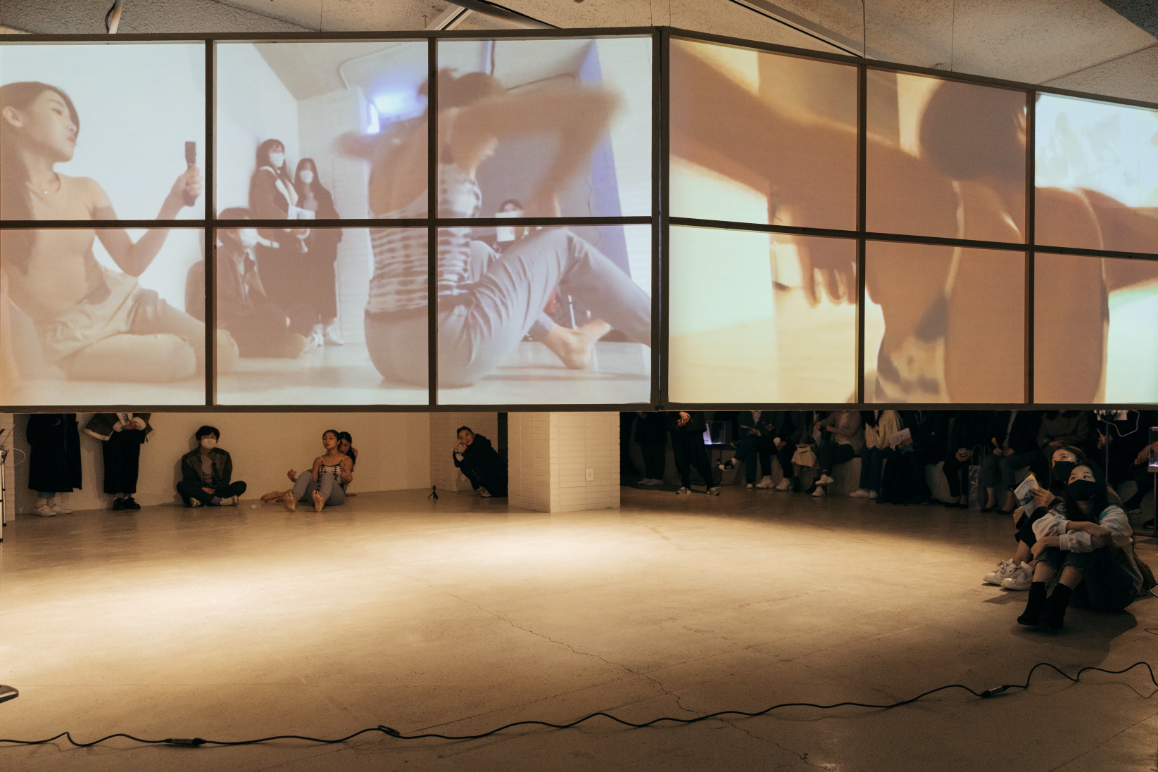 그렇다면 관객은 무엇을 보는 것일까. 아니 무엇을 볼 수 있는 것일까. 관객의 시선은 중계되는 스크린과 중계하는 몸과 동시에 그것을 벗어나기도 하는 몸 사이에 있다. 이 공간에 전시된 영상 작업들은 각 작업자들이 브이로그 형식으로 자신을 찍는 방법론을 적용한 것들이다. 이러한 자기 기술의 방식은 애초에 누군가를 상상적으로 앞당겨 의식하며 이뤄진다. 반면 무대에서의 자기 기술은 직접적인 대면이 아니라 시차의 기술 방식을 도입하는 셈이다. 하지만 이러한 중계에 대한 인지가 다시 퍼포머를 지배한다. 결과적으로 관객과 퍼포머는 결코 마주할 수 없는 시선과 시차를 갖는다.