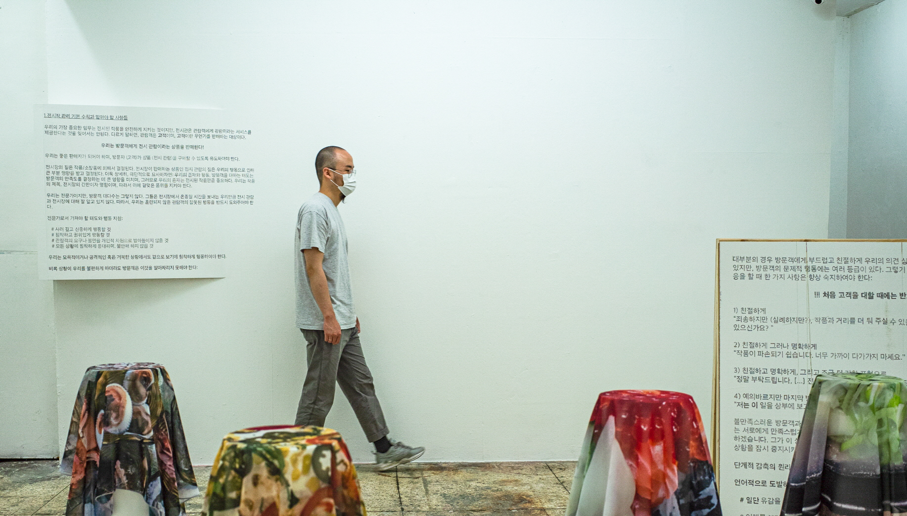 대부분 관람의 방식을 띠는, 따라서 공연화되는 전시상의 퍼포먼스가 아닌 관객이 들어오는 자의적 순간에 성립하는 퍼포먼스는 일반적인 전시의 외양을 재현하면서 그 자체의 고유성을 획득한다. 관객과의 일종의 게임에서 관객은 퍼포머의 자리를, 퍼포머로서의 자신의 자리를 인지하지 못한다. 여기서 작가는 퍼포머로 자신을 분할하며 전시의 요소들을 관객의 곁을 통해 재인지한다. 따라서 앞서 대상화되는 데 불편함을 겪게 하는 작가로서의 위치에서 벗어날 수 있다. 반면 이는 작가가 작가로서의 지위를 일시적으로 속임으로써 가능하다.