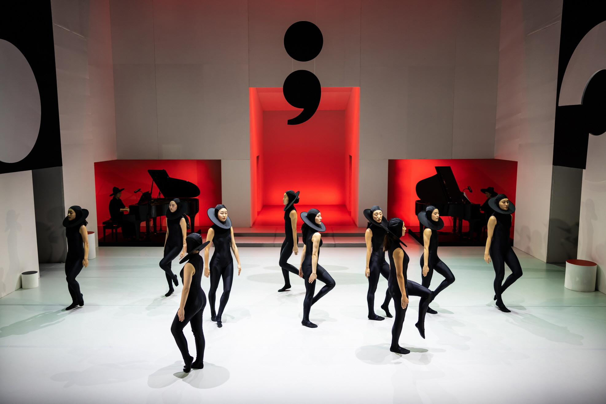 사실상 〈구두점의 나라에서〉는 거의 AI가 만든 것 아닐까 하는 정도의 정교함을 갖춘, 매 장이 어떤 하나의 스타일로 수렴되지 않는 차이 위에 차이가 쌓이는, 그보다는 차이를 차이가 지우는 어떤 강박적 태도로 진행되며, 다채로움의 양상으로 점철된다. 이는 음악이 그만큼의 다양한 변수를 갖고 있음에 움직임 역시 상응하도록 연출한 결과로 볼 수 있을 것이다. 몇 가지 부가적인 요소로서, 움직임이 강조되는 무대에서 마치 불순물처럼 눈에 띄는데, “구두점”이 무대 천장에서 내려오거나 무대 중앙에 들어간 벽 위에 영상으로 투사되거나 하며 제목을 상기하는 가운데, 검은색 계열의 무용수들의 의상 역시 그러한 문장 기호와 어느 정도 친연성을 가지고 있다고도 볼 수 있을 것이다.
