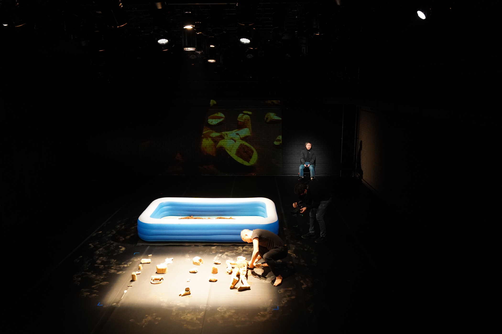 〈고랑 몰라〉(이경성 연출), 《기존의 인형들》 ⓒ조음기관(이하 상동). 인형-유해를 발굴하는 이경성과 이를 찍는 카메라맨, 후경의 유족의 목소리를 재현하는 장성익 배우. 이경성 연출의 〈고랑 몰라〉는 제주공항 부지에서 380여 구의 유해가 발굴된 사건을 모티브로 한다. 장성익 배우는 제주 4.3 사건 유가족의 진술을 버바텀으로 재현한다. 무대 오른쪽 깊숙이 앉은 배우의 말을 후경으로 하고, 보트 위에 깔린 흙을 뒤집어 인형의 관절들을 캐내는 이경성의 퍼포먼스와 이를 주변에서 맴돌며 비추는 카메라맨이 전경을 이루는 가운데, 실시간으로 중계되는 화면이 후면을 크게 잠식한다. 사실 제주도 말을 구사하는 배우의 말은 명확히는 전달되지 않는데, 이는 여기에 완전히 감응할 수 없는 인터뷰어의 지위를 관객에 체현시키려는 의도에 의한다고 보인다. 그리고 이경성이 캐내는 인형 관절은 4.3 사건의 피해자의 유해를 가리킨다.