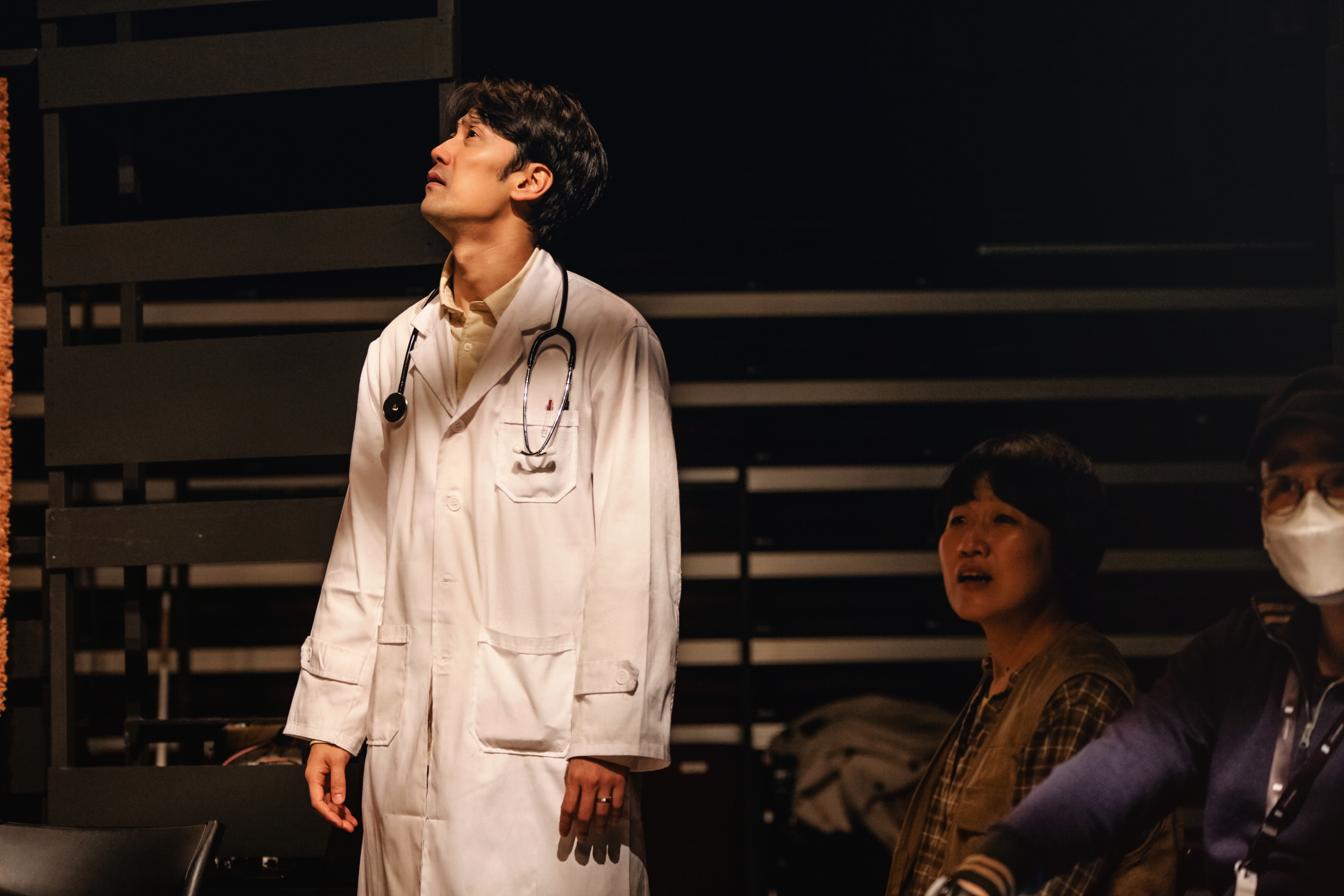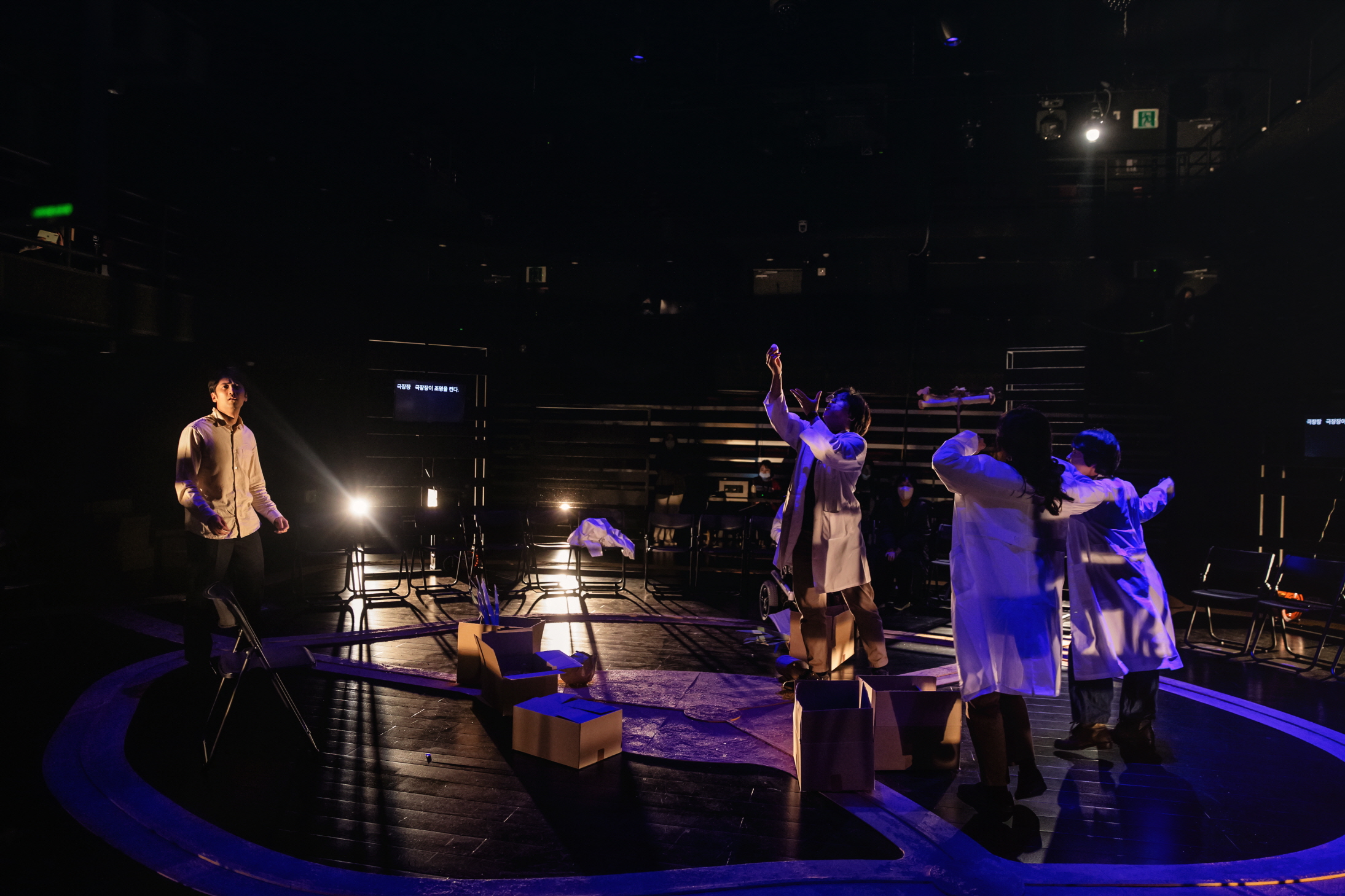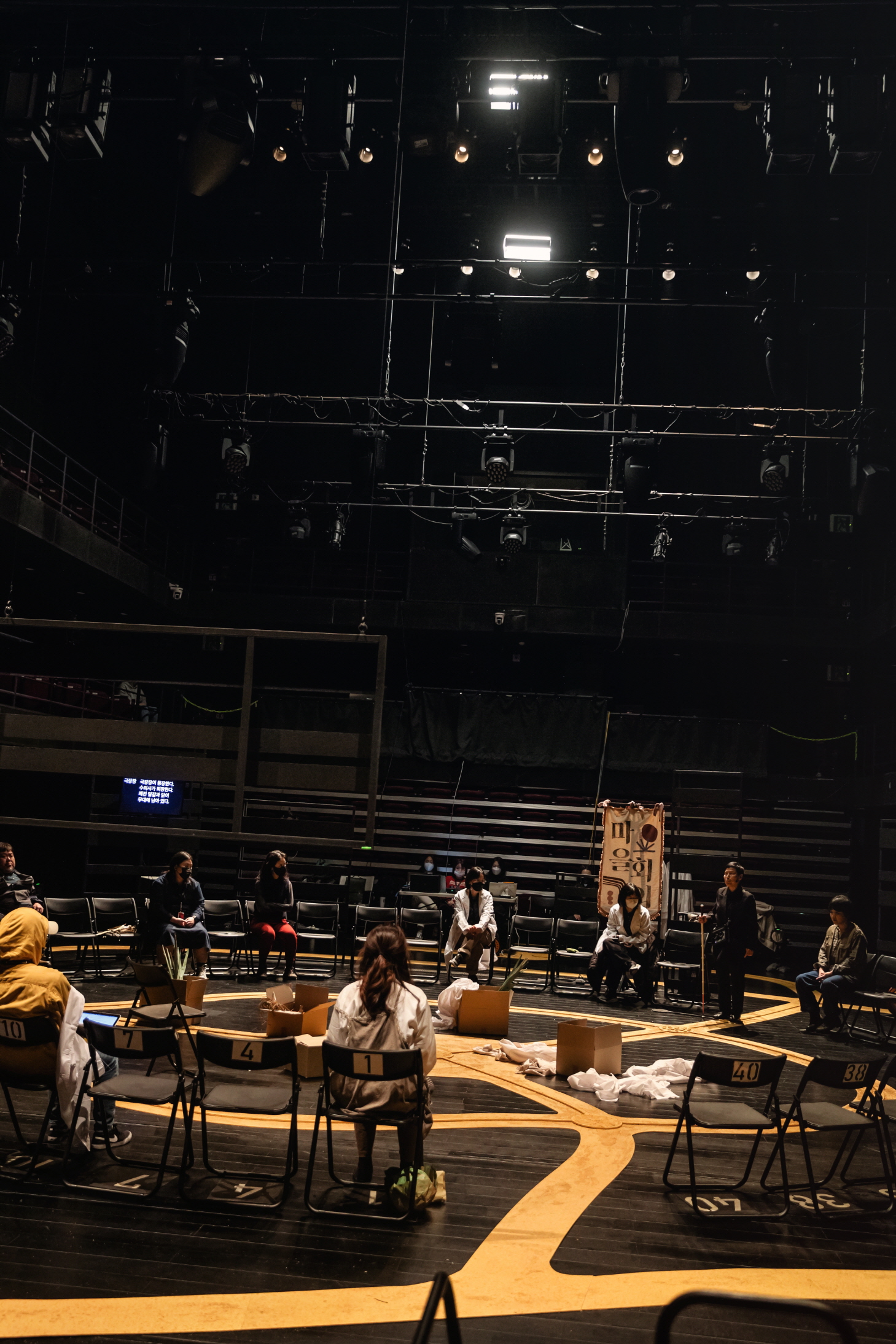 이연주 작, 정성경 연출, 〈어느 마을〉 리허설 장면 ⓒ김솔 [사진 제공=한국예술종합학교 연극원](이하 상동). 빈 의자에는 사실 관객의 자리로, 연극의 구성상, 빈 의자는 사실상 존재할 수 없다. 그리고 아직 객석 주변으로 중간중간 전시 모니터가 들어오지 않은 모습으로(모니터는 공연 전후에는 전시 스크리닝으로, 공연 중에는 문자 통역의 자막 기능을 한다.), 임시적으로 한 대의 스크린이 바깥쪽에 놓여 있음을 확인할 수 있다. 〈어느 마을〉은 장애인을 위한 동시적인 언어적 번역의 전개에서 나아가 이를 서사의 내용으로 함입한다. 원형으로 배우와 관객이 함께 둘러앉은, 현위치는 “어느 마을”이다. 그 바깥의 외부인이 등장하며 이 마을에 질문을 던지기 시작하는데, 그 다른 마을은 수어를 쓰는 마을이다. 수어를 쓰는 수의사(홍선우 배우)는 이후 등장하는 그 마을의 심리치료사(박준빈 배우)가 수어만 쓰는 것에 반해 말도 같이 하는데, 이런 이중 언어의 전략은 이 연극이 좇는 어떤 이상적 가치의 형상을 띤다. 따라서 〈어느 마을〉은 연극의 언어적 보완 장치로서 스크린의 자막과 배우 옆에 붙는 수어 통역사가 은폐되기보다 적극적으로 가시화되듯 수의사의 모습은 그런 연극의 주의(主義)를 메타적으로 지시한다. 곧 연극의 전략은 연극의 이념으로 치환된다, 그리고 완성된다.