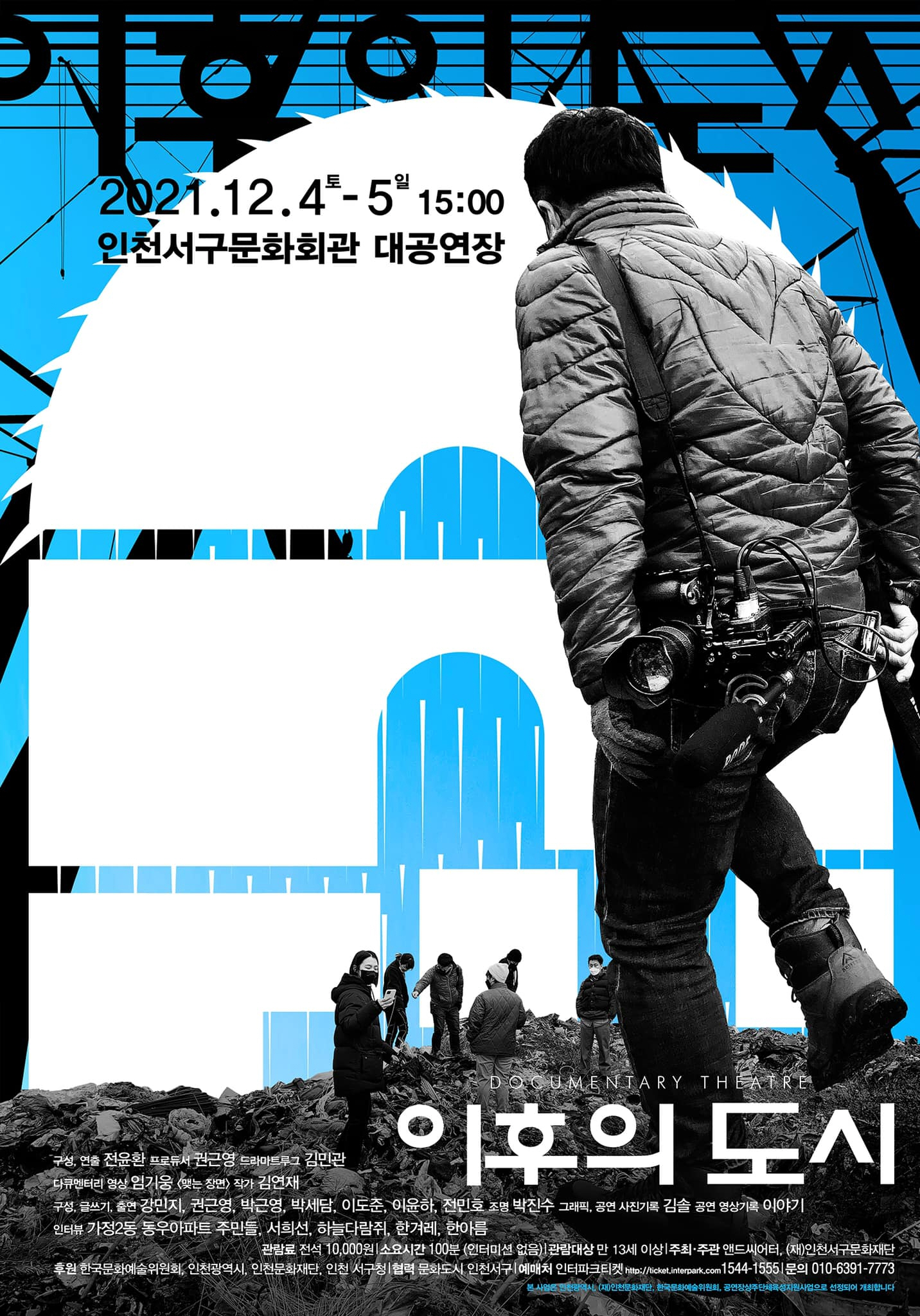 다큐멘터리 연극 〈이후의 도시〉(2021) 포스터. 이렇게 인제에 반짝 들르고, 강화도를 ‘접고’ 난 이후, 다시 만난 앤드씨어터는 어느새 인천 서구문화회관의 상주단체가 되어 서구를 소재로 한 연극을 준비하고 있었습니다. 서구는 재개발이 이뤄지는 도시라 폐허 위에 쓰인 역사의 현장이라고도 할 수 있을 것 같습니다. 배우들은 재개발, 청소년, 환경 등의 화두와 관련해 여러 서구 주민의 이야기를 듣고, 마침 냉동인간 관련 회사가 서구에 있어 과학자의 이야기를 듣기도 했습니다. 이런 리서치를 바탕으로 배우 자신의 발화를 곁들이면서 연극이 조금씩 만들어지기 시작했습니다. 저는 여기서도 드라마투르그를 맡게 되었습니다15.