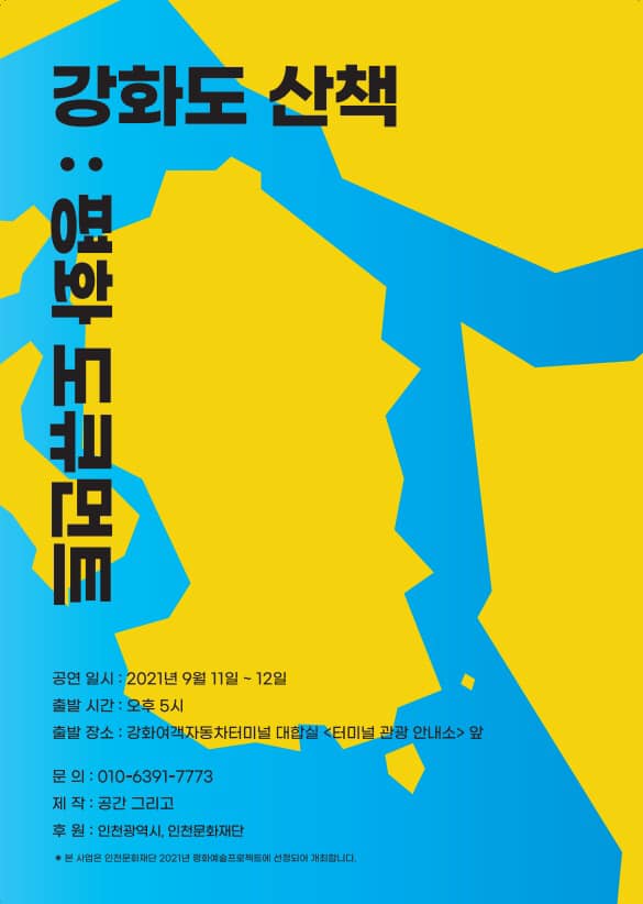 〈강화도 산책 : 평화 도큐먼트〉 (2021) 포스터. 작년 말에 부평문화센터의 상주단체로 있던 극단 앤드씨어터10를 만나게 되었는데, 한편으로 극단 일부가 인천 강화도 ‘공간 그리고’라는 공간11에 또 적을 두고 있어서 일요일마다 인천 강화도에 다니며 사람들과 오전에는 산을 타고 오후에는 강연을 듣고 스터디하는 시간을 갖게 되었습니다. “서해평화 프로젝트”라고 명명된 이 시간은 비슷한 이름의 리서치 기금을 받아 진행되었던 프로젝트의 일환이었습니다. 저는 책자를 만드는 역할로 초대되었습니다12.