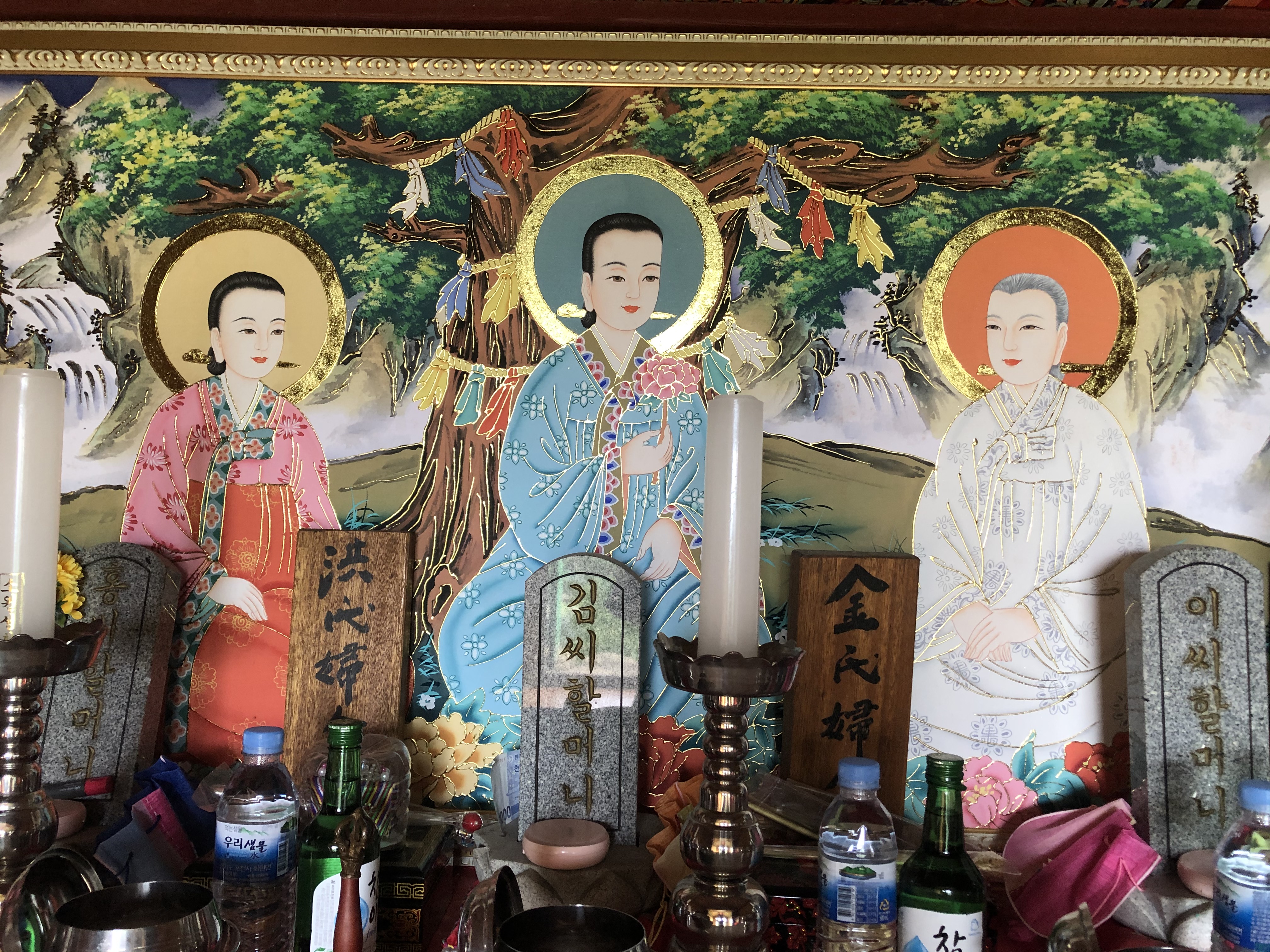 삼부인당 내부, 팔봉산 제2봉에 좌정한 삼여신 그림. 왼쪽부터 며느리 홍씨, 딸 김씨, 시어머니 이씨. ⓒ현지예. 홍천의 팔봉산 2봉에 있는 신당에는 여신 세 명이 그려진 불화가 있습니다18. 시어머니, 며느리, 딸로 이뤄진 성이 다른 세 명의 대안 가족은 어느 날 부둥켜안고 울며 신이 되었다고 합니다. 이 삼여신은 여성학자 김신명숙의 의견에 따른다면, 인간의 삶과 관계된 자연의 사이클을 의미하는 것으로 분석 가능하다고 합니다. 원형적 여신 신앙에는 탄생과 죽음의 여신이 각각 있고, 이 모두를 균형을 이루는 방향으로 적절하게 관장하는 대모신이 있다고 합니다. 이 세 여신의 관계가 이러한 신화로 표현된 것일 수 있다는 것입니다. 이러한 서사를 발견하고, 팔봉산에 작가들과 올랐다가 1봉에서 너무 비가 오는 바람에 급히 하산했던 기억이 있습니다. 음력 9월 9일에 열리는 당굿을 올해는 가고자 했지만, 코로나로 열리지 않아 가지 못했습니다. 언젠가는 가야지 했지만 가지 못하고 있습니다.