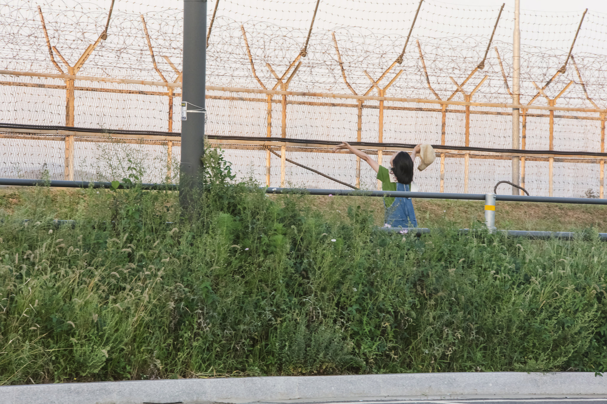 다시 철책선을 따라 차를 타고 이동합니다. 고려천도공원의 주차장에 도착하자마자 배우 한 명이 뛰쳐나가 철책선에 붙어 북한을 바라보고 “국가”에게 “평화”롭냐고 묻습니다. ‘북한’은 직접 언급되는 대신 “너”로 이야기됩니다. 이러한 국가 혹은 북한에 대한 의인화 기법은 국가나 북한을 우리와 먼 추상적 개념이 아니라, 친근하고 접근 가능한 것으로 바꿉니다. 이윤하라는 배우 자신의 전략이자 자신의 말인데, 조금 놀랍습니다.