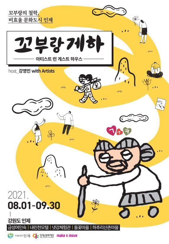 꼬부랑게하(2021) 포스터. 강영민 작가의 그림을 바탕으로 만든 포스터이다. 그 전에 경성콤, 강영민 작가와의 인연으로 강원도 인제에 잠깐 내려갔다 오게 되었습니다14. 그렇지만 인제에서 자리를 잡고 활동하는 예술가를 만나지는 못했습니다. 오만한 생각이겠지만, 아마 제가 생각하는 컨템퍼러리 예술가가 거기에는 있을 것 같지도 않기는 합니다. 강영민 작가가 금성여인숙에 머물며 그 역할을 기꺼이 하고 있었습니다. 그와 함께 지역을 보는 또는 접근하는 또 다른 방편이 생겨났는데, 자연을 곁에 두는 방식이 그것입니다. 길을 내고 그 길을 좇아가는 천릿길 투어, 강변에서 달을 보며 캠핑하는 시간 등이 특별했습니다.